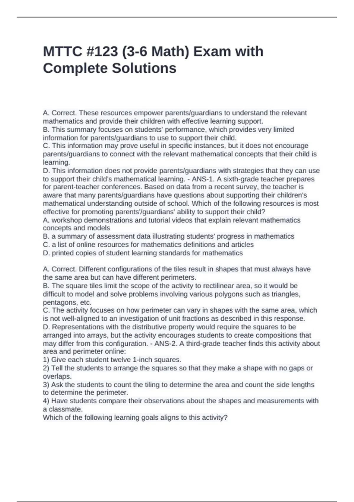 to support their child's mathematical learning. - ANS-1. A sixth-grade teacher prepares