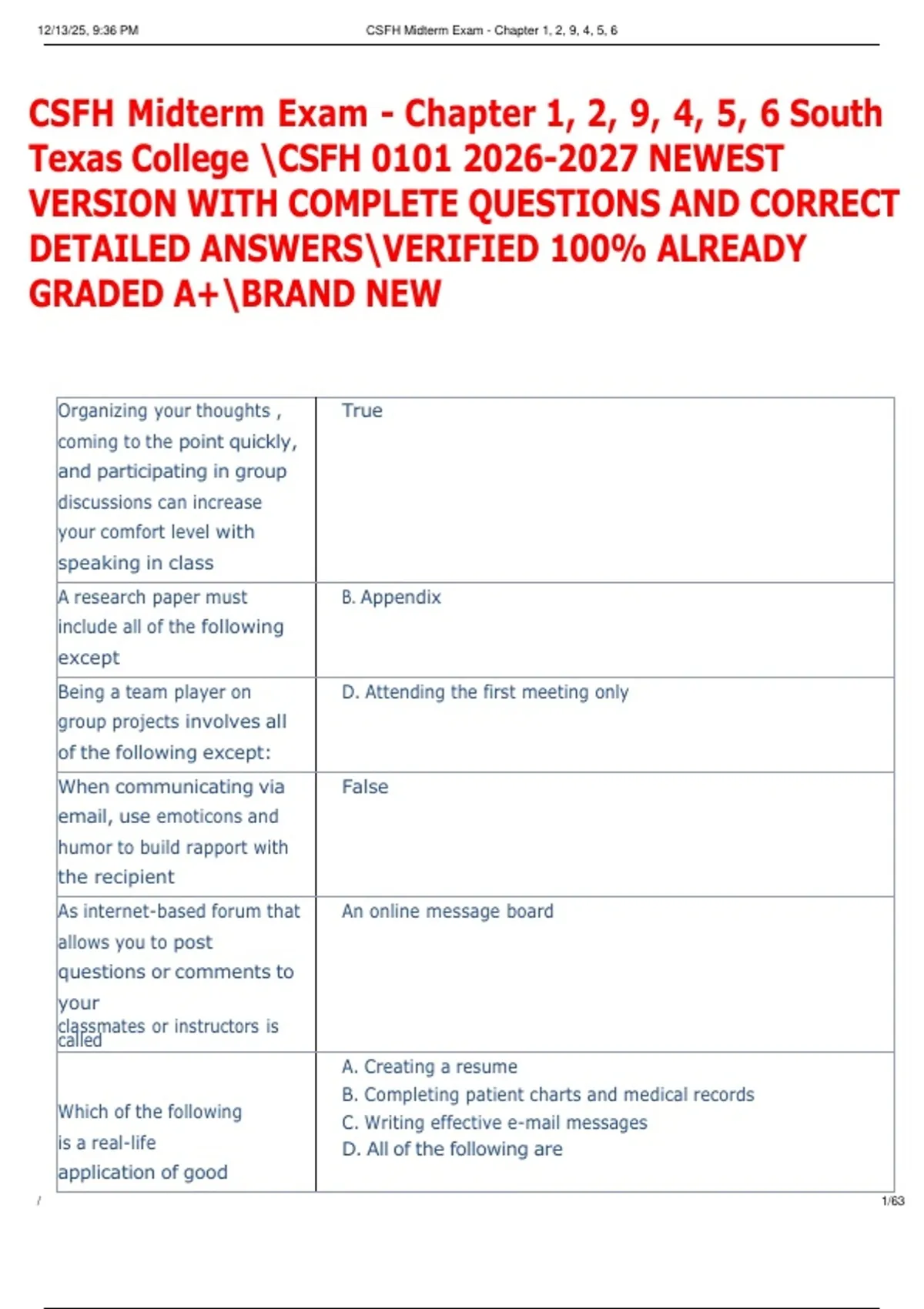 CSFH Midterm Exam - Chapter 1, 2, 9, 4, 5, 6 South Texas College CSFH NEWEST VERSION WITH COMPLETE QUESTIONS AND CORRECT DETAILED ANSWERSVERIFIED 100% ALREADY GRADED A+BRAND NEW