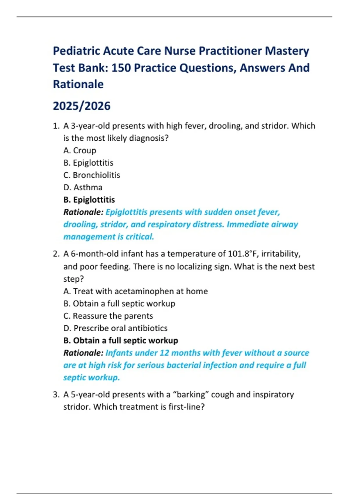 Pediatric Acute Care Nurse Practitioner Mastery Test Bank: 150 Practice Questions, Answers And Rationale 2025/2026