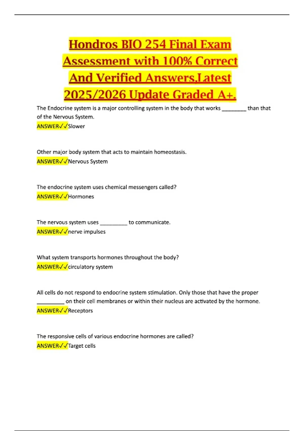 This document provides a comprehensive final exam assessment for Hondros BIO 254, featuring exam questions with 100% verified correct answers. It covers all major biological concepts, systems, and applied principles assessed throughout the entire course. The material is designed to deliver a complete and reliable review aligned with the latest 2025/2026 curriculum update.This document provides a comprehensive final exam assessment for Hondros BIO 254, featuring exam questions with 100% verified correct answers. It covers all major biological concepts, systems, and applied principles assessed throughout the entire course. The material is designed to deliver a complete and reliable review aligned with the latest 2025/2026 curriculum update.This document provides a comprehensive final exam assessment for Hondros BIO 254, featuring exam questions with 100% verified correct answers. It covers all major biological concepts, systems, and applied principles assessed throughout the entire course. The material is designed to deliver a complete and reliable review aligned with the latest 2025/2026 curriculum update.