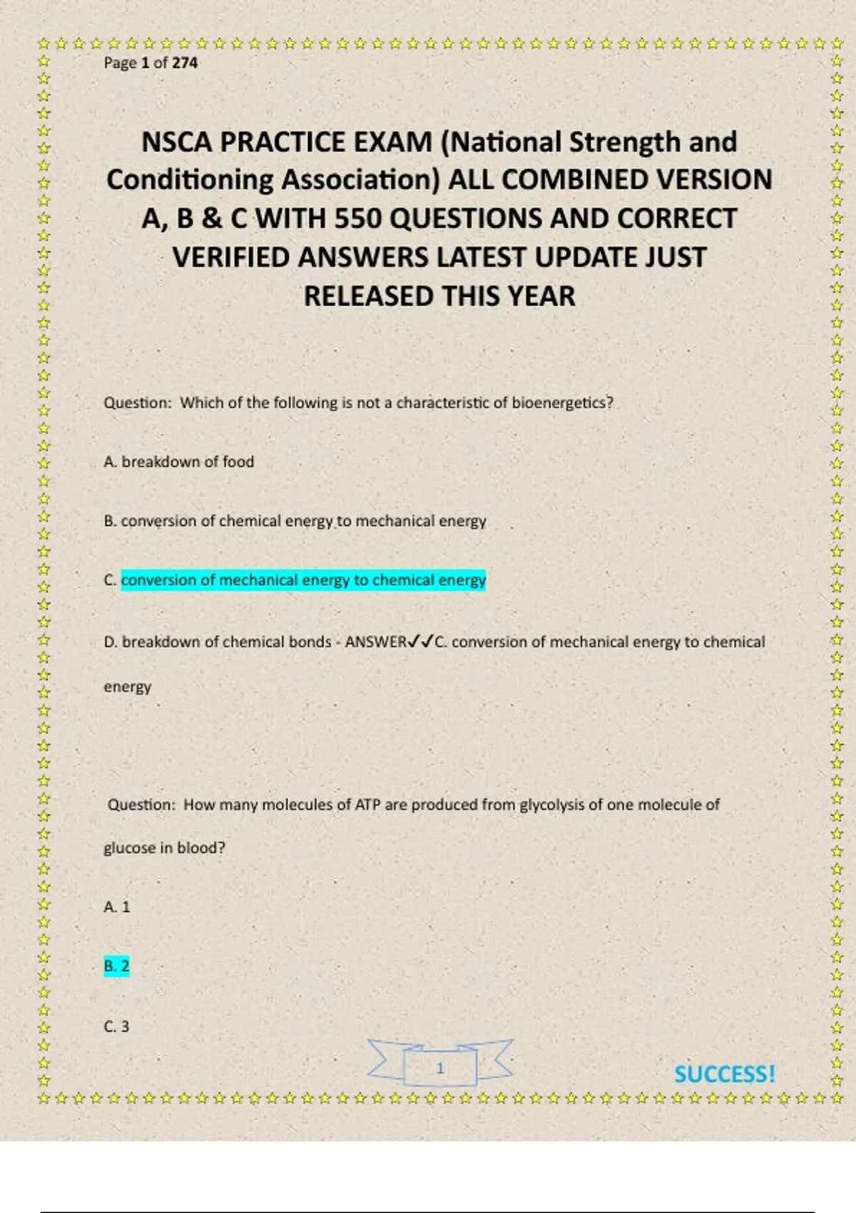 NSCA PRACTICE EXAM (National Strength and Conditioning Association) ALL COMBINED VERSION A, B & C WITH 550 QUESTIONS AND CORRECT VERIFIED ANSWERS LATEST UPDATE JUST RELEASED THIS YEAR
