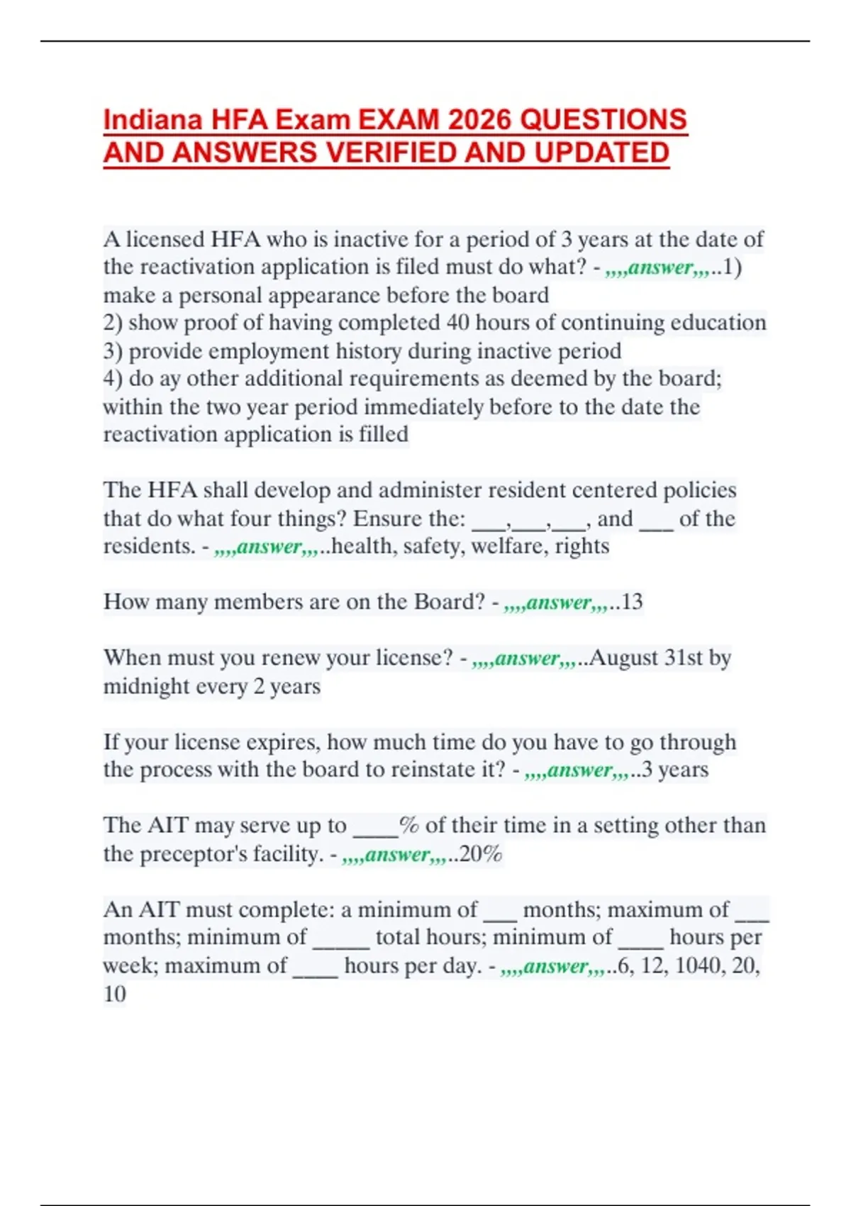 Indiana HFA Exam EXAM 2026 QUESTIONS AND ANSWERS VERIFIED AND UPDATED