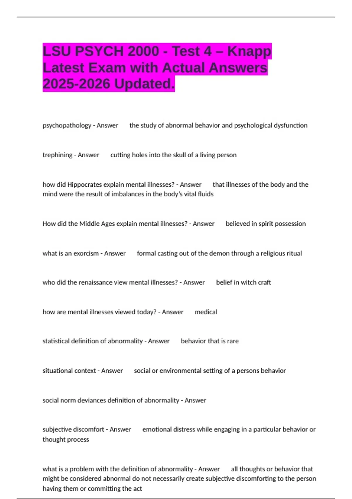 psychological disorder - Answer defined as any pattern of behavior of psychological