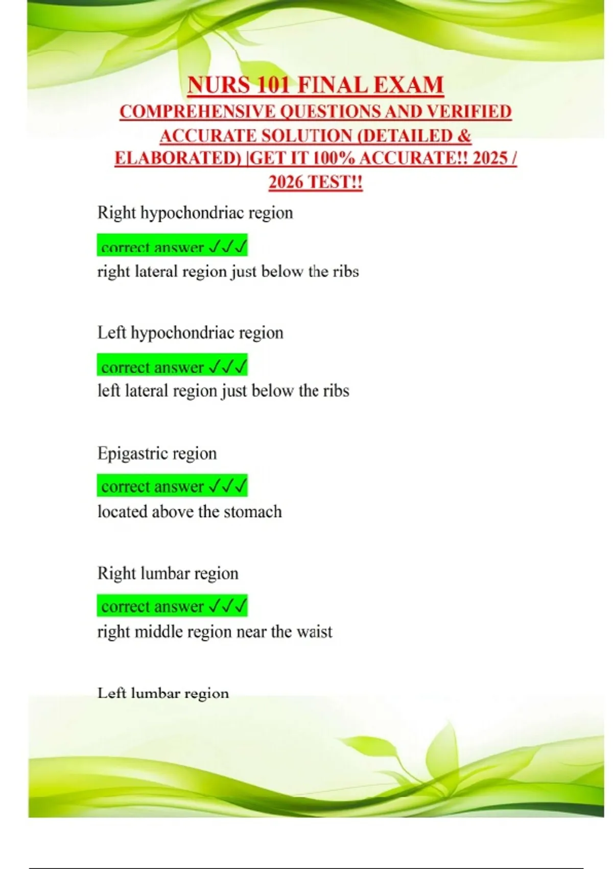 NURS 101 FINAL EXAM COMPREHENSIVE QUESTIONS AND VERIFIED ACCURATE SOLUTION (DETAILED & ELABORATED) |GET IT 100% ACCURATE!! 2025 / 2026 TEST!! Right hypochondriac region correct answer right lateral region just below the ribs Left hypochondriac region correct answer left lateral region just below the ribs Epigastric region correct answer located above the stomach Right lumbar region correct answer right middle region near the waist Left lumbar region correct answer left middle region near the waist Umbilical region correct answer the centermost region, which includes the umbilicus Right inguinal region correct answer right lower region near the groin Left inguinal region correct answer left lower region near the groin Hypogastric region correct answer located below the stomach "o" correct answer most common combining suffix Neur correct answer nerve Nephrectomy correct answer surgical removal of a kidney Enteritis correct answer inflammation of the intestine Dermo correct answer skin Hematology correct answer study of blood Thrombocyte correct answer a clotting cell; a platelet Catabolism correct answer metabolic pathways that break down molecules, releasing energy. -ic correct answer pertaining to -ectomy is a what correct answer suffix Disc correct answer pad of cartilage between vertebrae Where is the thumb located to the body when in the anatomical position