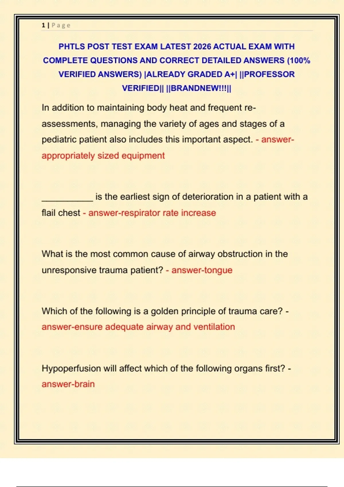 PHTLS POST TEST EXAM LATEST 2026 ACTUAL EXAM WITH
