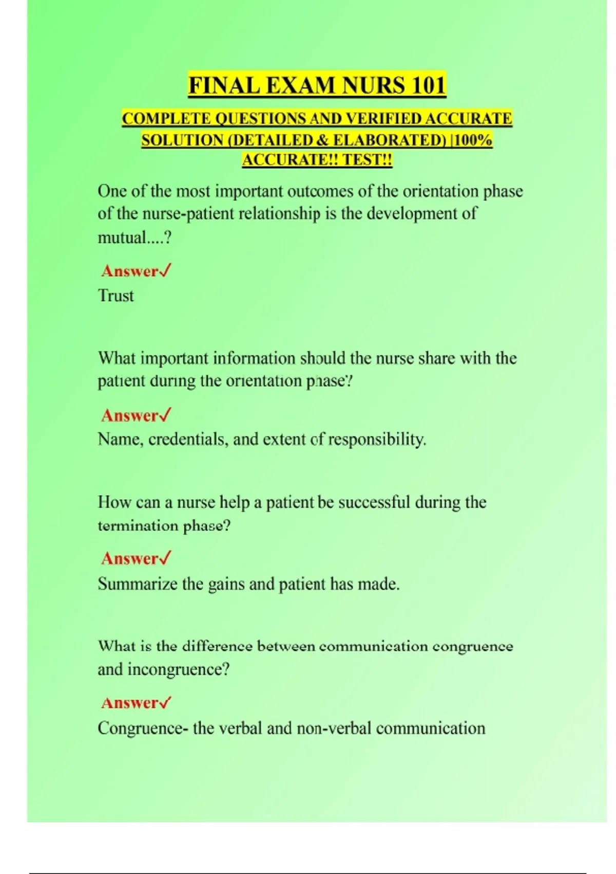 FINAL EXAM NURS 101 COMPLETE QUESTIONS AND VERIFIED ACCURATE SOLUTION (DETAILED & ELABORATED) |100% ACCURATE!! TEST!!