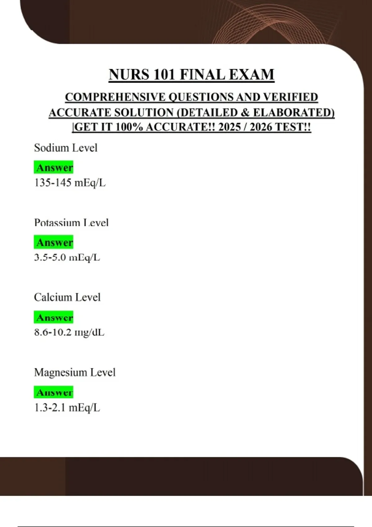 NURS 101 FINAL EXAM COMPREHENSIVE QUESTIONS AND VERIFIED ACCURATE SOLUTION (DETAILED & ELABORATED) |GET IT 100% ACCURATE!! 2025 / 2026 TEST!! Sodium Level Answer 135-145 mEq/L Potassium Level Answer 3.5-5.0 mEq/L Calcium Level Answer 8.6-10.2 mg/dL Magnesium Level Answer 1.3-2.1 mEq/L Chloride Level Answer 97-107 mEq/L Phosphate Level Answer 2.5-4.5 mg/dL Hyponatremia Answer Sodium <135; confusion, seizures, hypotension, muscle cramps, weakness Hypernatremia Answer Hypokalemia Answer Sodium >145; weakness, confusion, hallucinations, dry mouth, decreased urine output Potassium <3.5; weakness, muscle cramps, fatigue, paresthesia, dysrhythmias, confusion