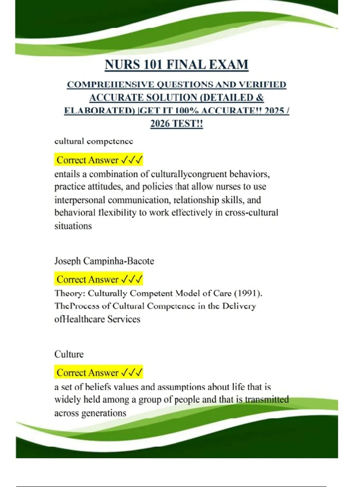 NURS 101 FINAL EXAM COMPREHENSIVE QUESTIONS AND VERIFIED ACCURATE SOLUTION (DETAILED & ELABORATED) |GET IT 100% ACCURATE!! 2025 / 2026 TEST!!