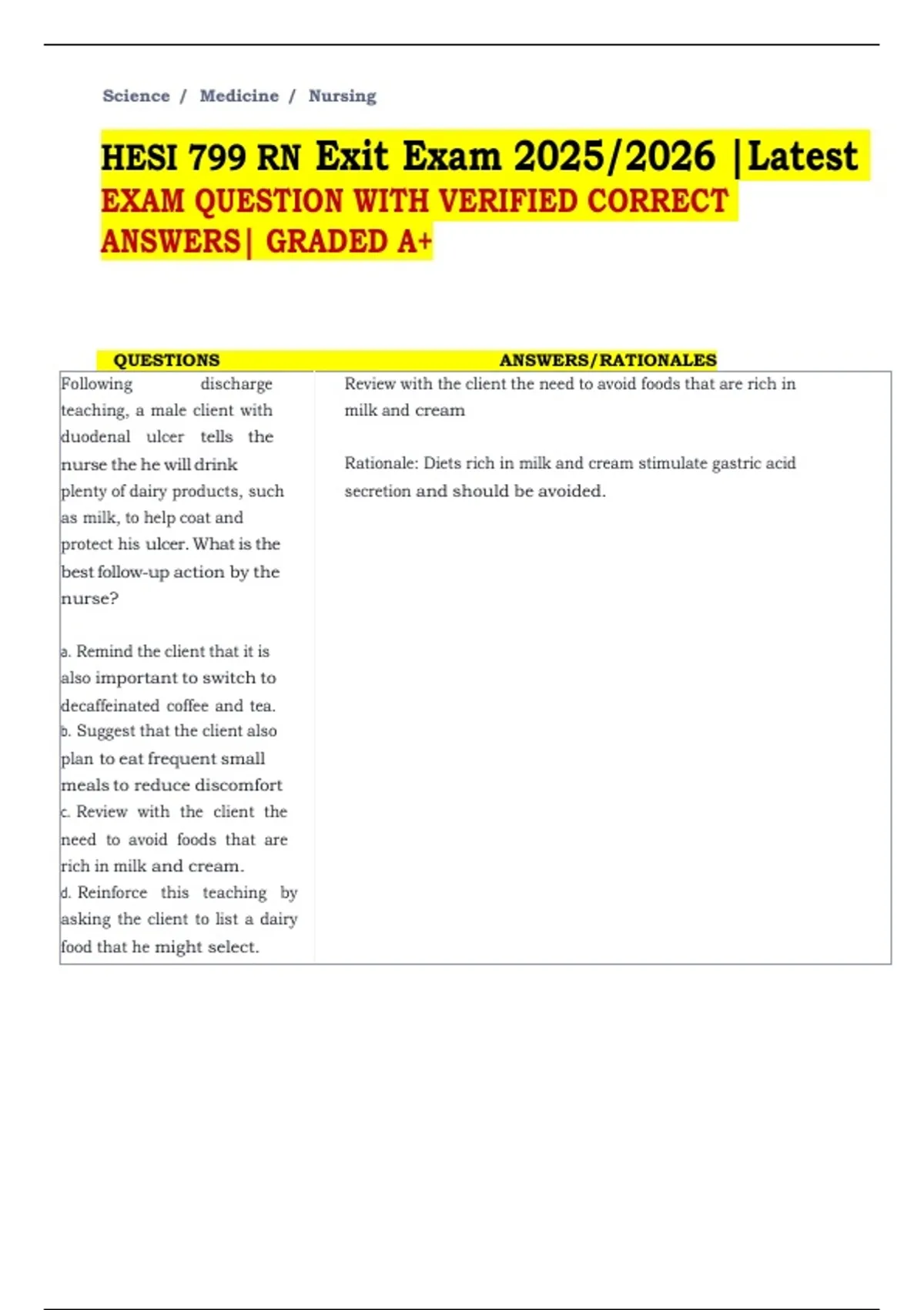 This comprehensive study guide features the latest 2025/2026 version of the HESI 799 RN Exit Exam, containing hundreds of real exam-style questions with verified correct answers and detailed rationales. Designed specifically for registered nursing students preparing to graduate and take their licensing exam, it covers critical topics such as medical-surgical nursing, pharmacology, maternal-child health, psychiatric nursing, gerontology, and community health. Each question includes multiple-choice options, the correct answer highlighted, and an evidence-based rationale explaining why the answer is correct and why others are incorrect. Ideal for final program exit preparation and NCLEX-RN review, this high-yield resource helps reinforce clinical judgment, prioritize patient care, and master essential nursing concepts, ensuring users achieve top scores and confidently transition into professional practice. Graded A+ material trusted by thousands of nursing students.