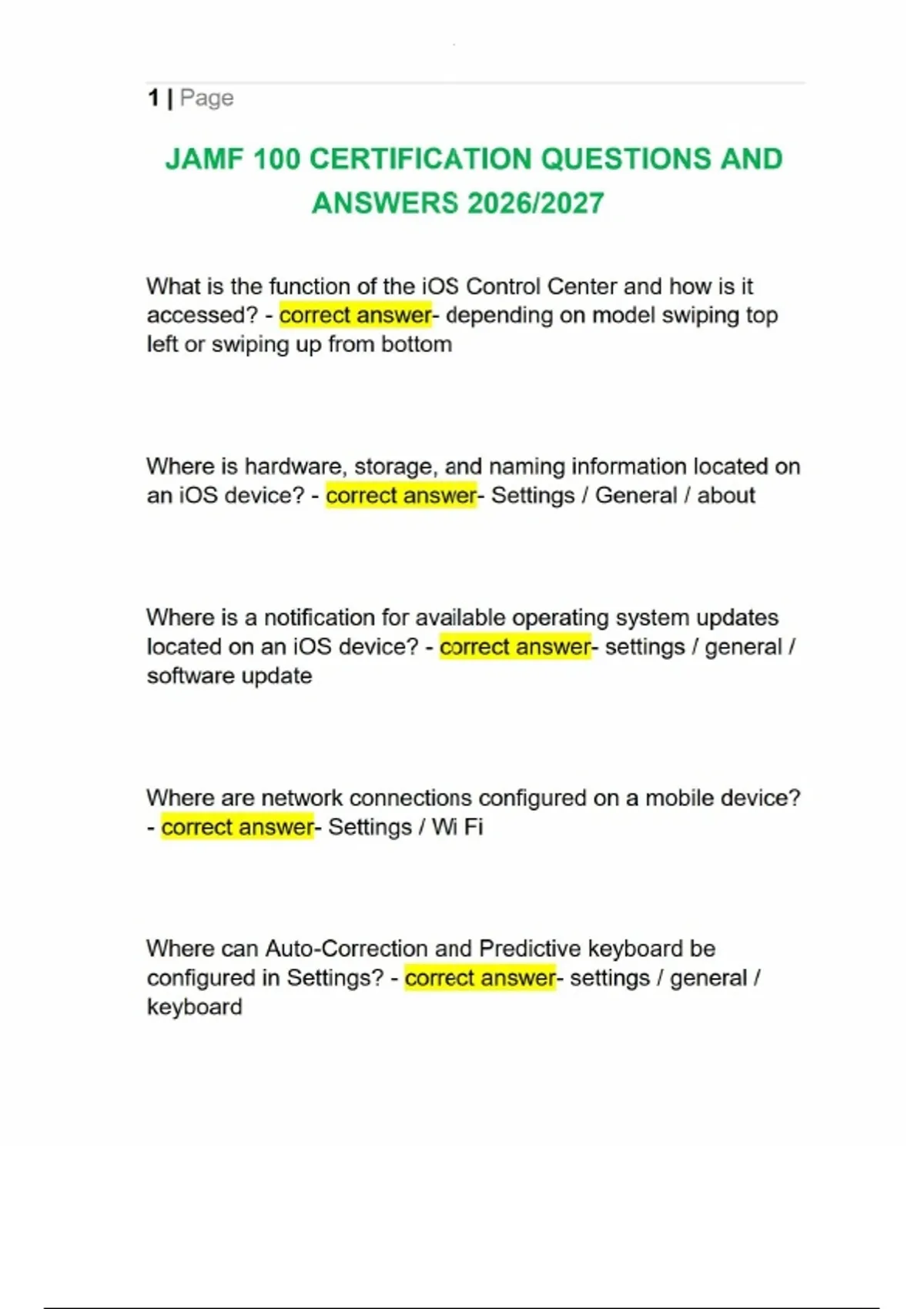 JAMF 100 CERTIFICATION QUESTIONS AND ANSWERS 2026/2027 What is the function of the iOS Control Center and how is it accessed? - correct answer- depending on model swiping top left or swiping up from bottom Where is hardware, storage, and naming information located on an iOS device? - correct answer- Settings / General / about Where is a notification for available operating system updates located on an iOS device? - correct answer- settings / general / software updat