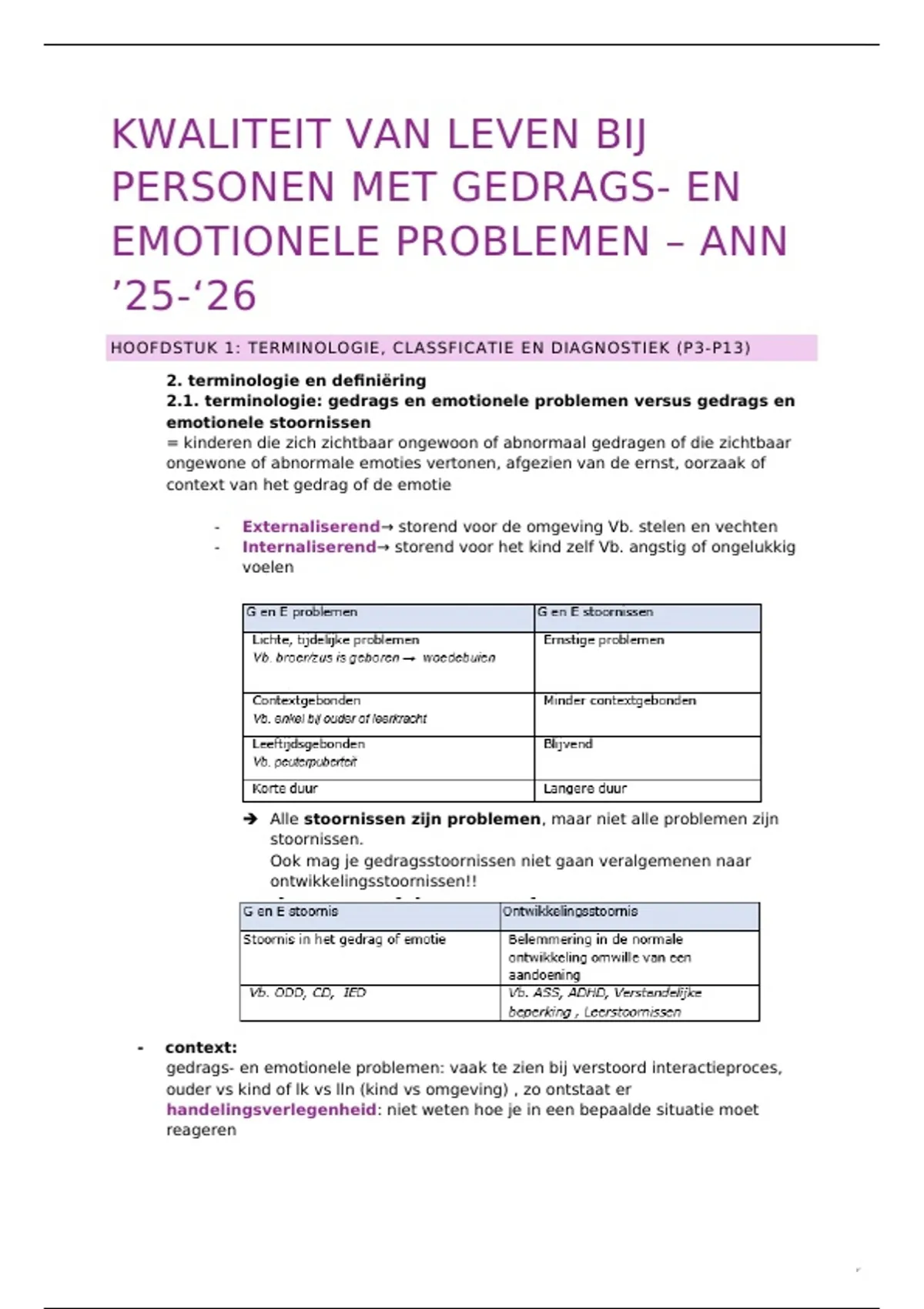 samenvatting van de geziene hoofdstukken in het vak kwaliteit van gedrags en emotionele problemen