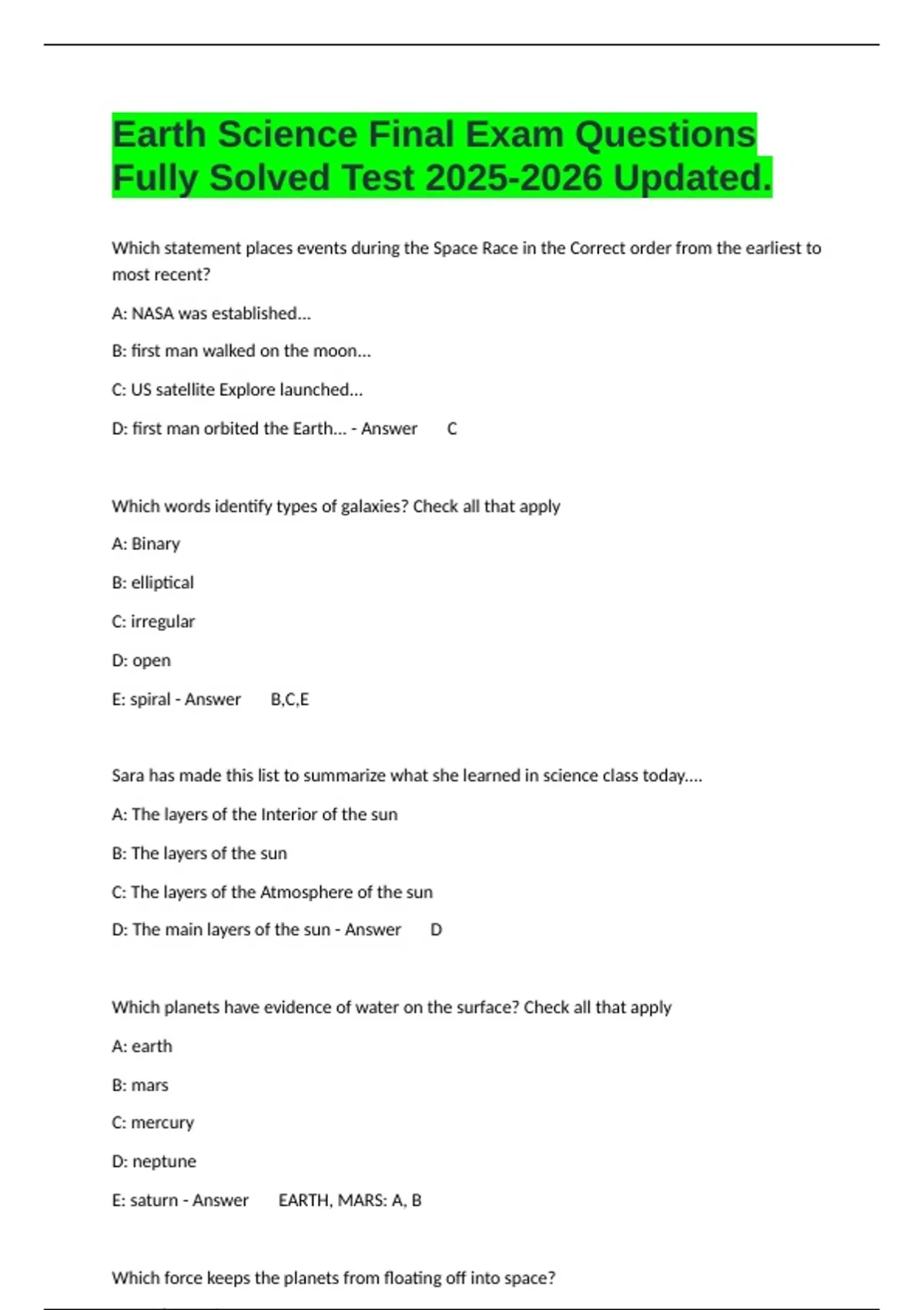 Earth Science Final Exam Questions Fully Solved Test Updated.