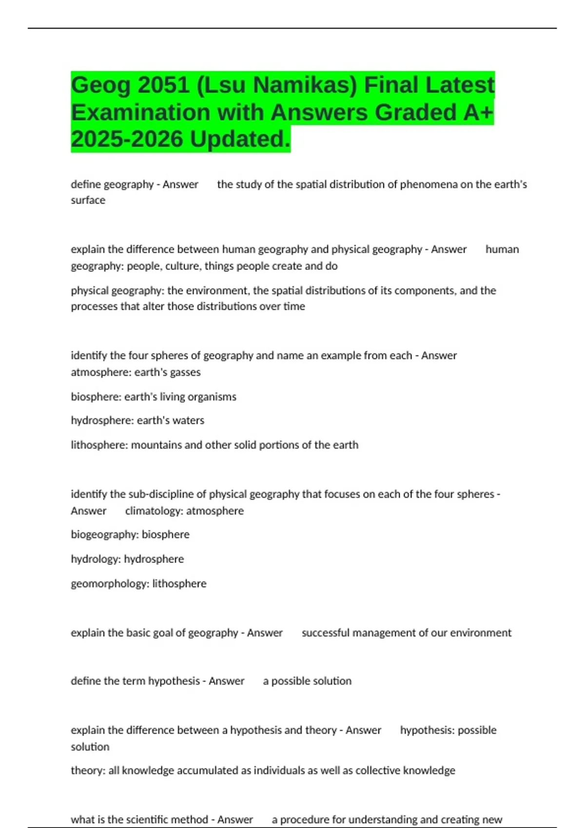 identify the four spheres of geography and name an example from each - Answer
