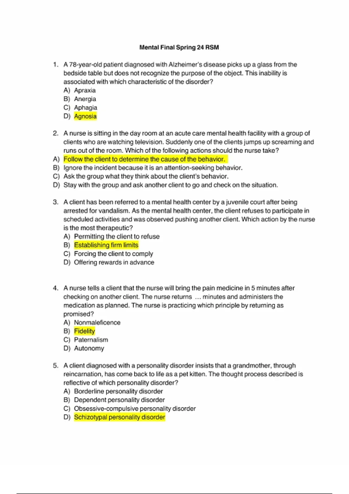 Mental Final Spring 25 RSM A 78-year-old patient diagnosed with Alzheimer’s disease picks up a glass from the bedside table but does not recognize the purpose of the object. This inability is associated with which characteristic of the disorder? A) Apraxia B) Anergia C) Aphagia D) Agnosia A nurse is sitting in the day room at an acute care mental health facility with a group of clients who are watching television. Suddenly one of the clients jumps up screaming and runs out of the room. Which of the following actions should the nurse take? Follow the client to determine the cause of the behavior. Ignore the incident because it is an attention-seeking behavior. Ask the group what they think about the client’s behavior. Stay with the group and ask another client to go and check on the situation. A client has been referred to a mental health center by a juvenile court after being arrested for vandalism. As the mental health center, the client refuses to participate in scheduled activities and was observed pushing another client. Which action by the nurse is the most therapeutic? A) Permitting the client to refuse B) Establishing firm limits C) Forcing the client to comply D) Offering rewards in advance A nurse tells a client that the nurse will bring the pain medicine in 5 minutes after checking on another client. The nurse returns ... minutes and administers the medication as planned. The nurse is practicing which principle by returning as promised? A) Nonmaleficence B) Fidelity C) Paternalism D) Autonomy A client diagnosed with a personality disorder insists that a grandmother, through reincarnation, has come back to life as a pet kitten. The thought process described is reflective of which personality disorder? A) Borderline personality disorder B) Dependent personality disorder C) Obsessive-compulsive personality disorder D) Schizotypal personality disorderCluster A includes paranoid, schizoid, and schizotypal personality disorders. Clients diagnosed with schizotypal personality disorder are characterized by peculiarities of ideation, appearance, and behavior; magical thinking; and deficits in interpersonal relatedness that are not severe enough to meet the criteria for schizophrenia. In the question, this client's statement reflects ideations of magical thinking . Ateenage and a teenager’s parents visit the clinic to discuss the teen’s skin picking. There are many bleeding wounds and various stages of scabs up and down both arms. The parents are very upset about the behavior and want it to stop. Which would the health care provider document? A) Control dysfunction B) Body dysmorphic disorder C) Excoriation disorder D) Disrupted family dynamics Rationale:Excoriation disorder (skin picking) is the inability to stop recurrent picking at skin for emotional release or anxiety release. Body dysmorphic disorder is a preoccupation with slight or imagined physical defects that are not apparent to others. There is not enough information to diagnose disrupted family dynamics or control issues within the family unit. . The nurse caring for a client diagnosed with Alzheimer disease can anticipate that the family will need info about which medication ...? A) Acetylcholinesterase inhibitors B) Antidepressants C) Benzodiazepines D) Antihypertensives Memory deficit is thought to be related to a lack of acetylcholine at the synaptic level. Acetylcholinesterase inhibitor drugs prevent the chemical that destroys acetylcholine from acting, thus leaving more available acetylcholine . A nurse tells the child and caregiver that the nurse will interview each of them separately. The caregiver questions why this needs to ... occur. What is the nurse’s best response? A) “By interviewing separately | can validate all the information.” B) “Parents know best and | will determine this during the interview.” C) “Research shows that info validates the child’s feeling.” D) “Both interviews provide unique and meaningful info.” To get an accurate picture of the child, the nurse should interview the child and parent individually because each can provide unique meaningful information. Research has shown that when parent and child are interviewed separately the children provide information about internalizing symptoms and9. 10. 11, 12, 13. the parents provide information about externalizing symptoms. The nurse is providing discharge teaching for a patient diagnosed with posttraumatic stress disorder (PTSD). Which patient statement indicates further teaching? A) “lwill use abdominal breathing at the first sign of anxiety.” B) “l will use distraction techniques when | feel moderate stress.” C) “l'will drink a few beers when | am anxious.” D) “l will go to the gym for kickboxing class when | have negative feeling.” Using alcoholic beverages as a means of controlling anxiety indicates the need for further teaching. The other patient statements indicate understanding of the discharge teaching provided by the nurse. A nurse is caring for a client who begins to yell and scream at staff members. Which of the following should be the nurse’s priority? A) Administer haloperidol IM to the client. B) Engage the client is an activity. C) Move the client to a seclusion room with continuous observation. D) Say to the client, “I can tell that you are upset.” Client suffering from which sleep disorder may be helped by losing excess weight and using oral appliances during sleep? A) Insomnia B) Restlessleg syndrome C) Obstructive sleep apnea syndrome D) Narcolepsy client suffering from obstructive sleep apnea syndrome (OSAS) may be helped by losing excess weight and using oral appliances during sleep. OSAS is characterized by repeated episodes of partial or complete obstruction of the upper airway during sleep, leading to disrupted sleep and decreased oxygen levels. Weight loss can reduce the severity of the airway obstruction, and oral appliances can help keep the airway open. Missing A patient 