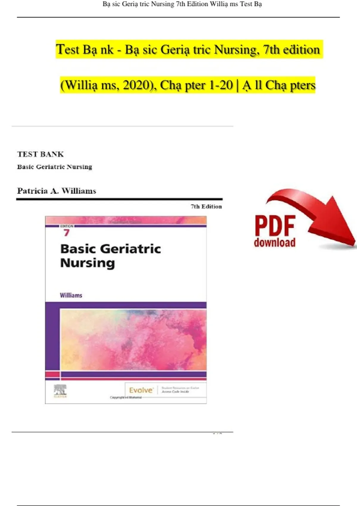 , Bạ sic Geriạ tric Nursing 7th Eḋition Williạ ms Test Bạ