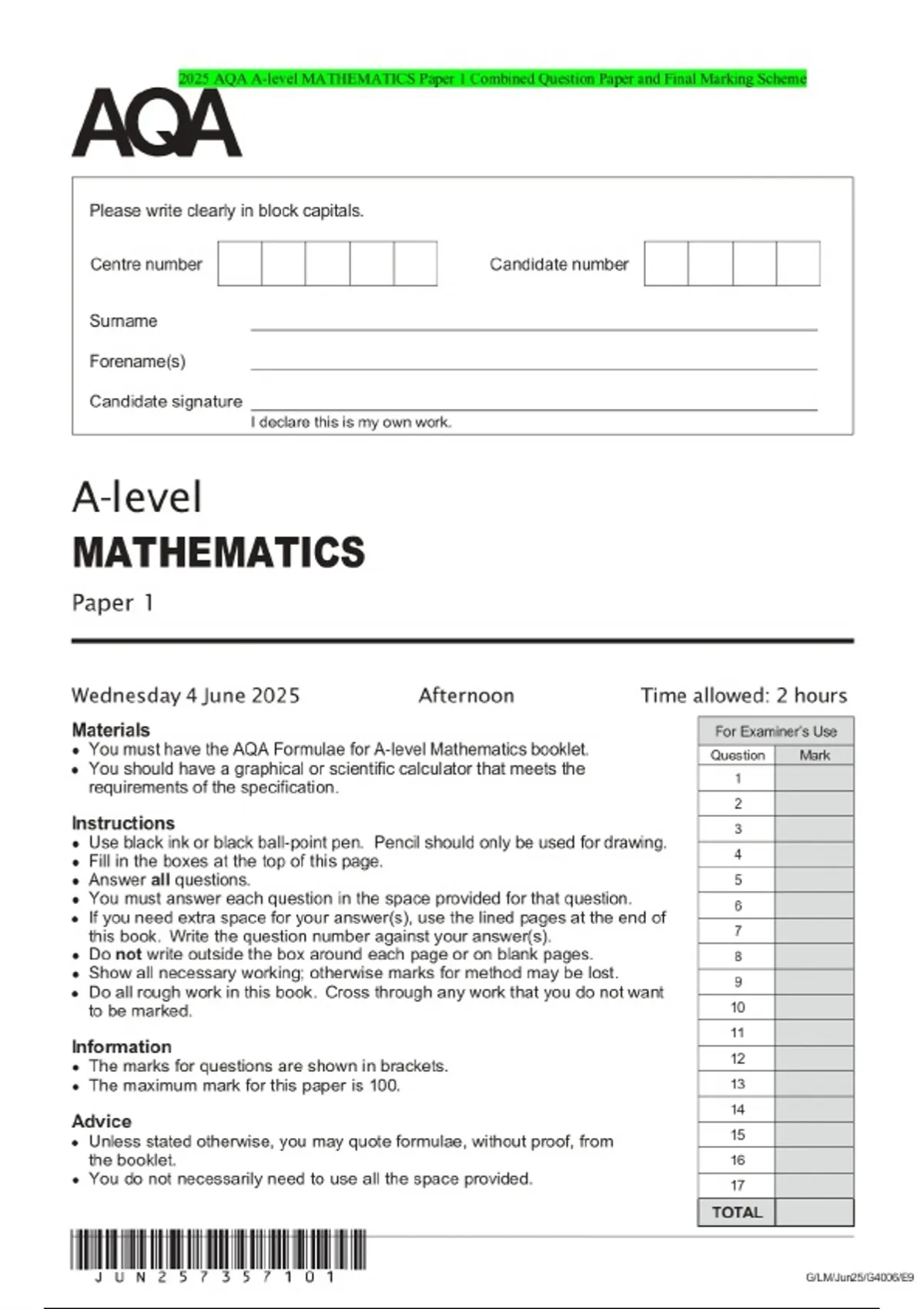 2025 AQA A-level MATHEMATICS Paper 1 Combined Question Paper and Final Marking Scheme