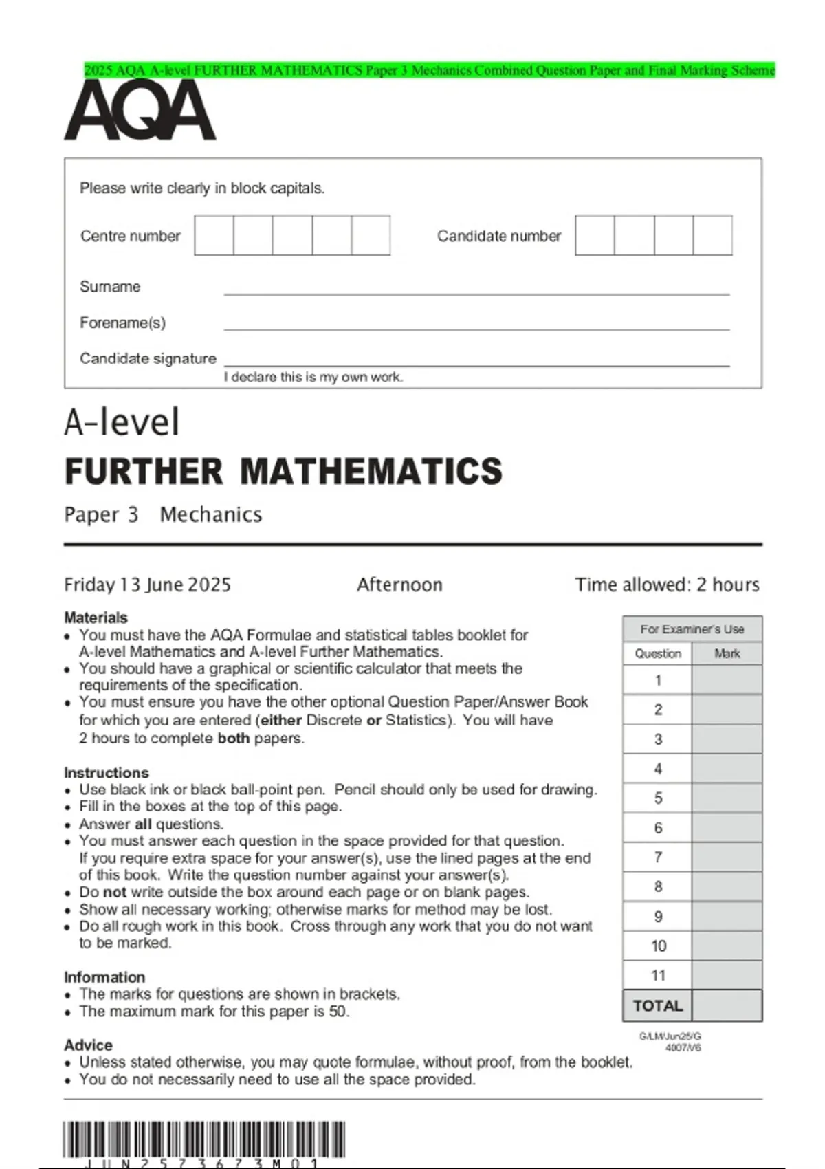 2025 AQA A-level FURTHER MATHEMATICS Paper 3 Mechanics Combined Question Paper and Final Marking Scheme