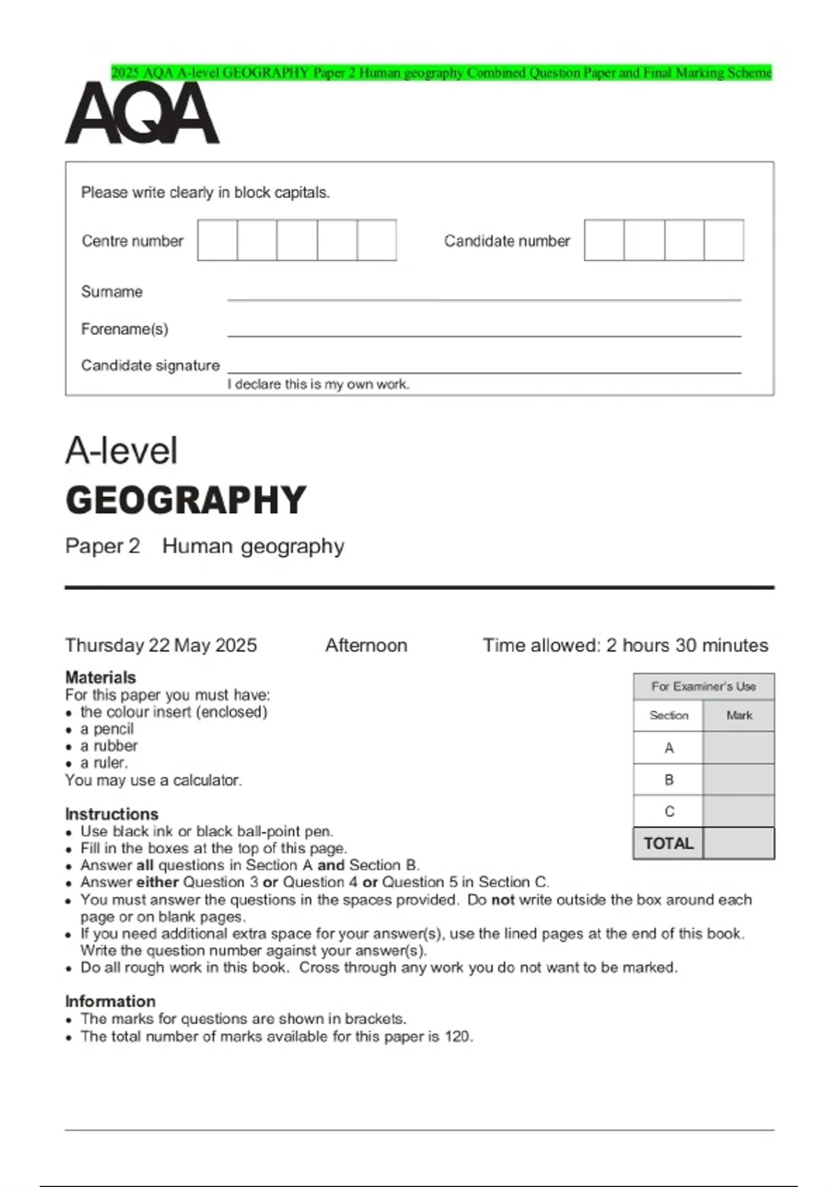 2025 AQA A-level GEOGRAPHY Paper 2 Human geography Combined Question Paper and Final Marking Scheme