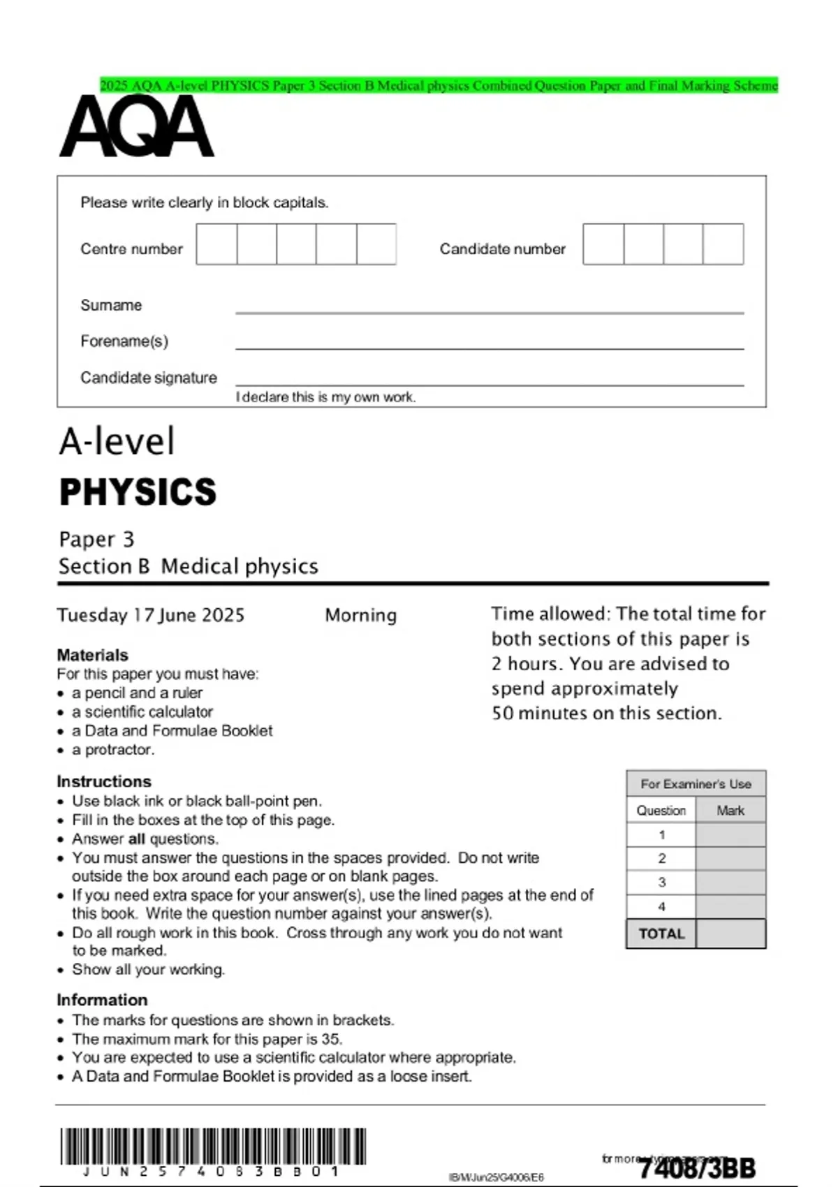 2025 AQA A-level PHYSICS Paper 3 Section B Medical physics Combined Question Paper and Final Marking Scheme