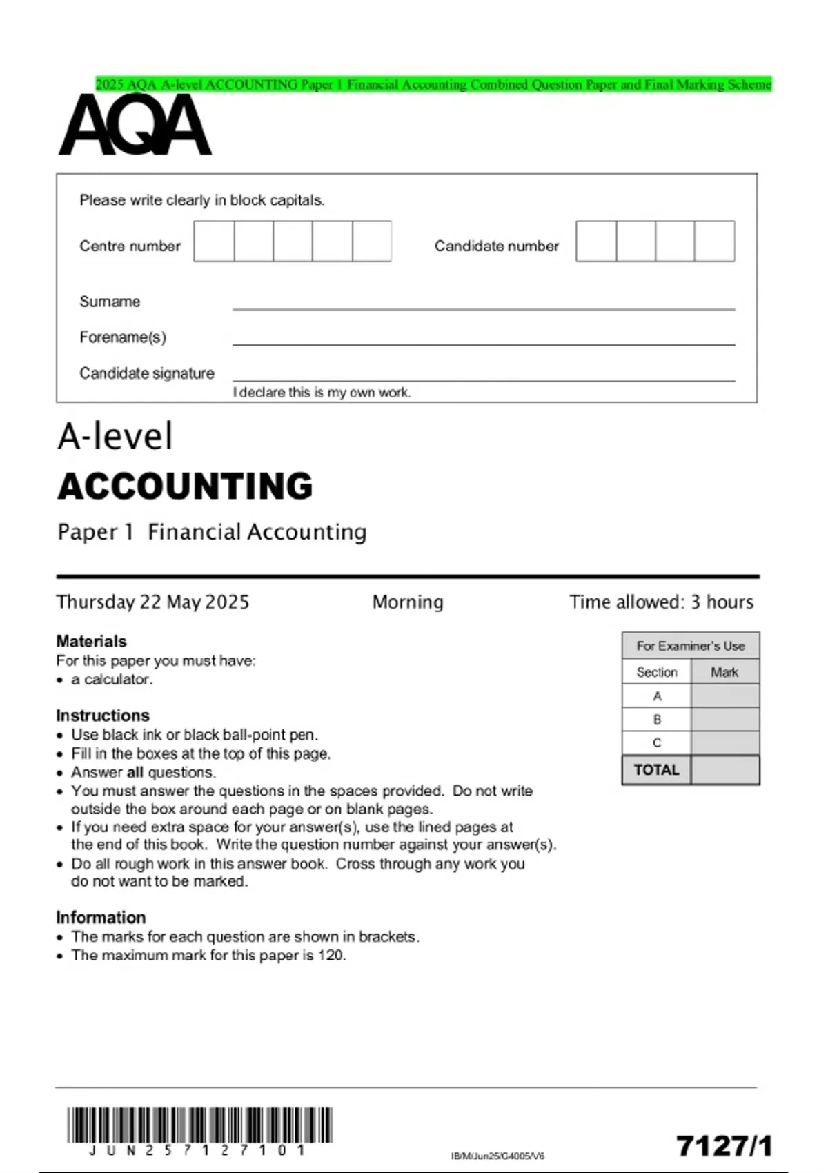 2025 AQA A-level ACCOUNTING Paper 1 Financial Accounting Combined Question Paper and Final Marking Scheme