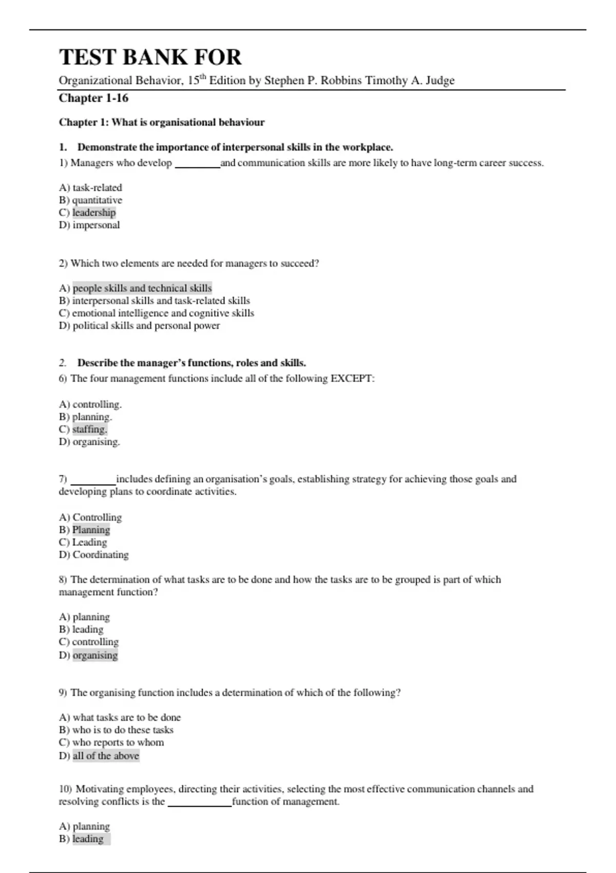 This document contains a comprehensive test bank for Organizational Behavior, 15th Edition by Stephen P. Robbins and Timothy A. Judge, covering chapters 1 through 16. It includes a wide range of practice questions designed to assess understanding of core organizational behavior concepts, theories, and applications, making it suitable for exam preparation and self-study.