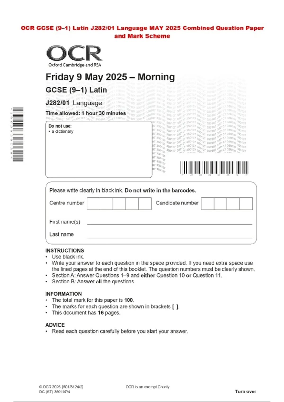 OCR GCSE (9–1) Latin J282/01 Language MAY 2025 Combined Question Paper and Mark Scheme