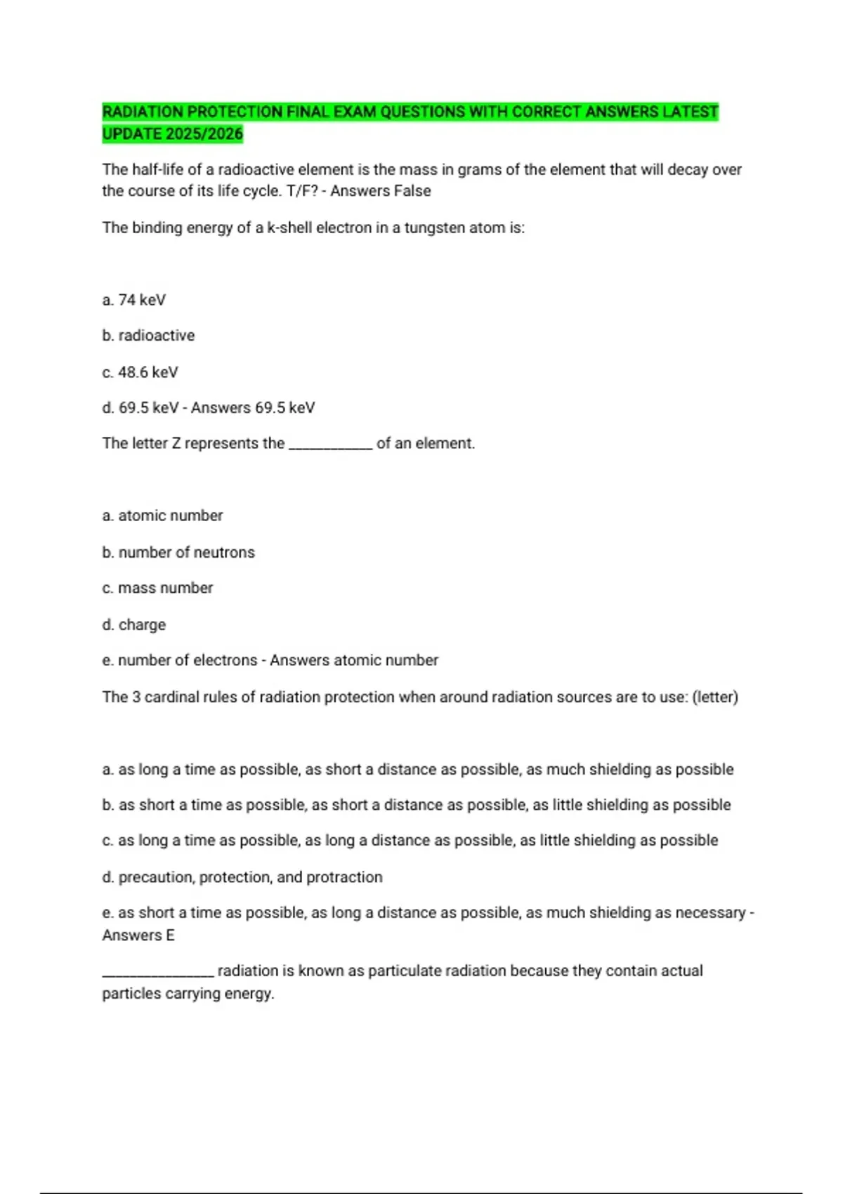 RADIATION PROTECTION FINAL EXAM QUESTIONS WITH CORRECT ANSWERS LATEST UPDATE 2025/2026 The half-life of a radioactive element is the mass in grams of the element that will decay over the course of its life cycle. T/F? - Answers False The binding energy of a k-shell electron in a tungsten atom is: a. 74 keV b. radioactive c. 48.6 keV d. 69.5 keV - Answers 69.5 keV The letter Z represents the ____________ of an element. a. atomic number b. number of neutrons c. mass number d. charge e. number of electrons - Answers atomic number The 3 cardinal rules of radiation protection when around radiation sources are to use: (letter) a. as long a time as possible, as short a distance as possible, as much shielding as possible b. as short a time as possible, as short a distance as possible, as little shielding as possible c. as long a time as possible, as long a distance as possible, as little shielding as possible d. precaution, protection, and protraction e. as short a time as possible, as long a distance as possible, as much shielding as necessary - Answers E ________________ radiation is known as particulate radiation because they contain actual particles carrying energy. 1. alpha 2. beta 3. gamma 4. x-rays a. 3 and 4 b. 1 and 3 c. 1 only d. 1 and 2 e. all of the above - Answers 1 and 2 The number of pulses in a wave cycle is: a. 1 b. 2 c. 3 d. 4 e. 0 - Answers 2 E = h x _____: a. T b. lambda c. c d. q e. f - Answers f The top of a wave is called the: a. amplitude b. trough c. crest d. period e. wavelength - Answers crest Which of the following is the symbol for tungsten? a. Pb b. T c. Tg d. W e. We - Answers W If an atom has a neutral charge, it has equal numbers of __________ and __________. a. protons, neutrons b. neutrons, electrons c. isotopes, ions d. protons, electrons - Answers protons, electrons X-rays were discovered by: a. Thomas Edison b. Wilhelm Roentgen c. Henry Radon d. Ben Franklin - Answers Wilhelm Roentgen ______________ is the process of adding or removing an electrons from an atom's outer shell. a. decay b. electrification c. elimination d. occupation e. ionization - Answers ionization Which of the following are types of electromagnetic radiation? a. alpha b. beta c. neutrons d. x-rays e. both c and d - Answers x-rays The metric prefix "k" stands for which of the following? a. 0.1 b. 0.001 c. 100 d. 1000 e. kinetic - Answers 0.001 In the metric system, length or distance is measured in the unit of: a. inches b. meters c. lambda