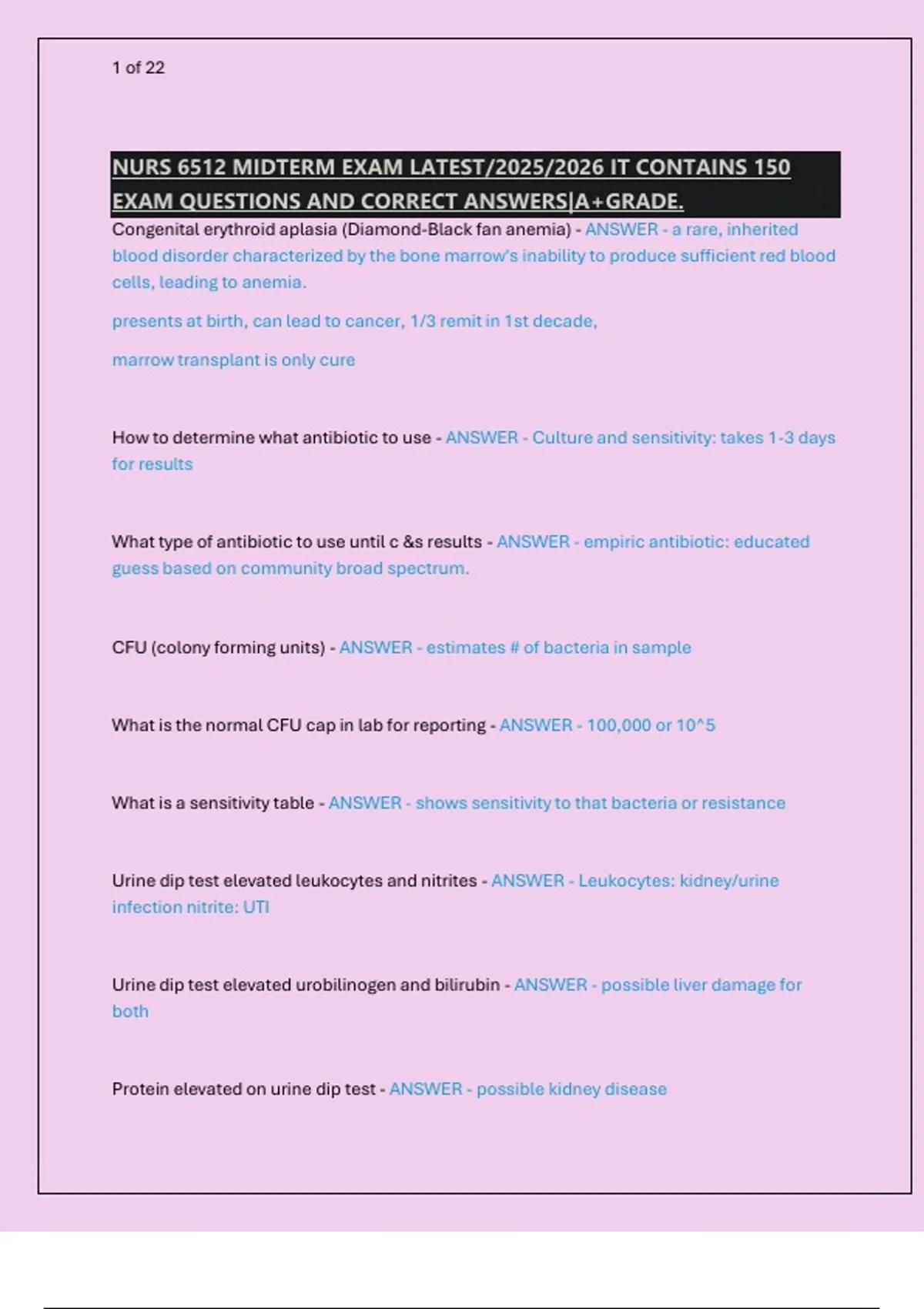 Prepare for your NURS 6512 Midterm Exam with this detailed study guide containing 150 comprehensive questions and verified answers. Covering essential topics in advanced health assessment, this resource includes key content on dermatology, hematology, endocrine disorders, cranial nerve testing, common skin conditions, urinary and blood diagnostics, abdominal assessment, and more. Designed for nursing students seeking an A+ grade, this guide provides clear explanations, clinical insights, and systematic review materials aligned with the latest 2025–2026 curriculum. Whether you're reviewing for exams or reinforcing clinical knowledge, this document is an invaluable tool for success in health assessment and pathophysiology.