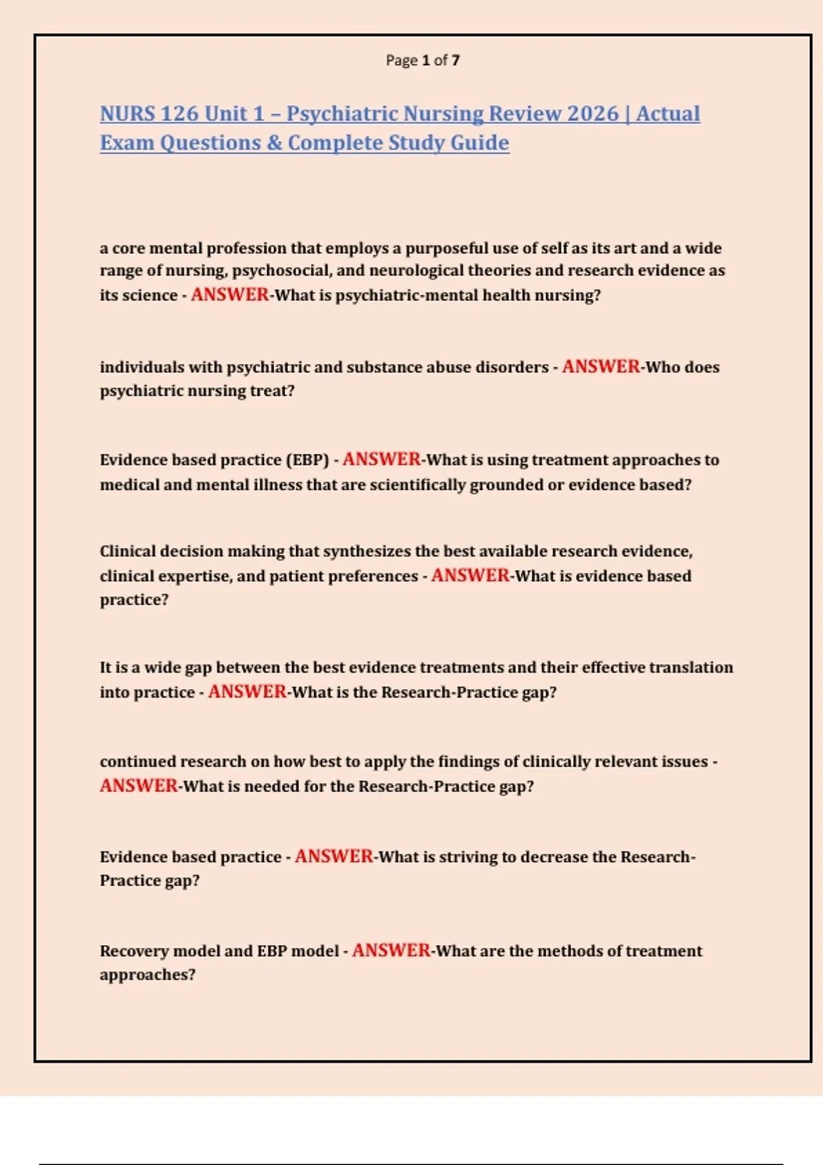 NURS 126 Unit 1 – Psychiatric Nursing Review 2026 | Actual