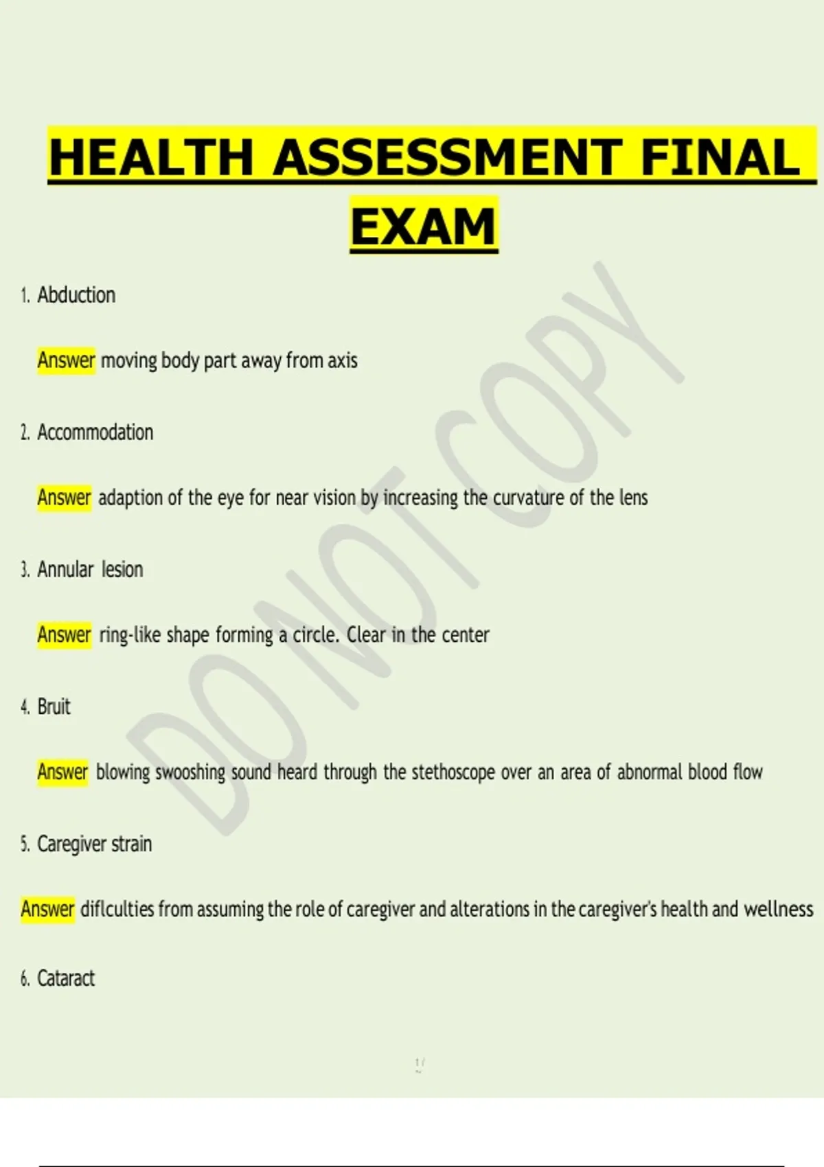 This document contains a comprehensive Health Assessment final exam covering the full scope of foundational nursing assessment knowledge and clinical skills required in nursing education. It provides clearly defined terms, concepts, and exam-ready content spanning all major areas of health assessment, making it a high-value resource for final exam preparation and cumulative review. The material thoroughly addresses anatomical terminology, range of motion, posture, gait, vital signs, pain assessment, skin lesions, edema grading, pressure injuries, and normal vs. abnormal physical findings across body systems. It includes detailed coverage of head-to-toe assessment techniques, cardiovascular and respiratory assessment (heart sounds, lung sounds, peripheral pulses), abdominal quadrants and organs, musculoskeletal assessment, and neurological evaluation including cranial nerves, reflexes, and cerebellar testing. In addition, the exam content strongly emphasizes the nursing process (ADPIE), levels of prevention, therapeutic communication, cultural and spiritual assessment, health history components, functional and instrumental ADLs, caregiver strain, and geriatric considerations. Risk factors for common conditions (e.g., breast cancer, colon cancer, gout), diagnostic screening tools, and patient safety concepts are also included. This resource is ideal for Health Assessment final exam study, reinforcing terminology mastery, clinical reasoning, and exam confidence for nursing students.