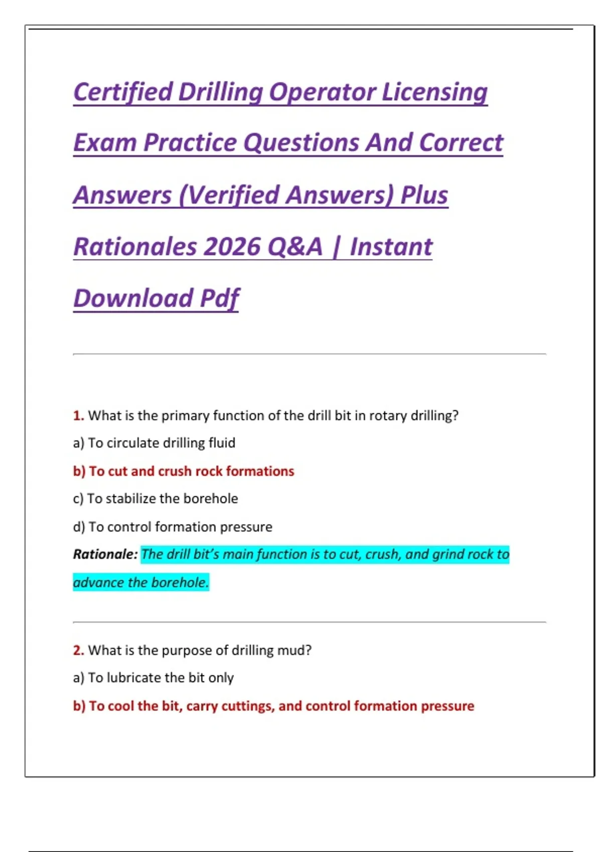 Certified Drilling Operator Licensing Exam Practice Questions And Correct Answers (Verified Answers) Plus Rationales 2026 Q&A | Instant Download Pdf