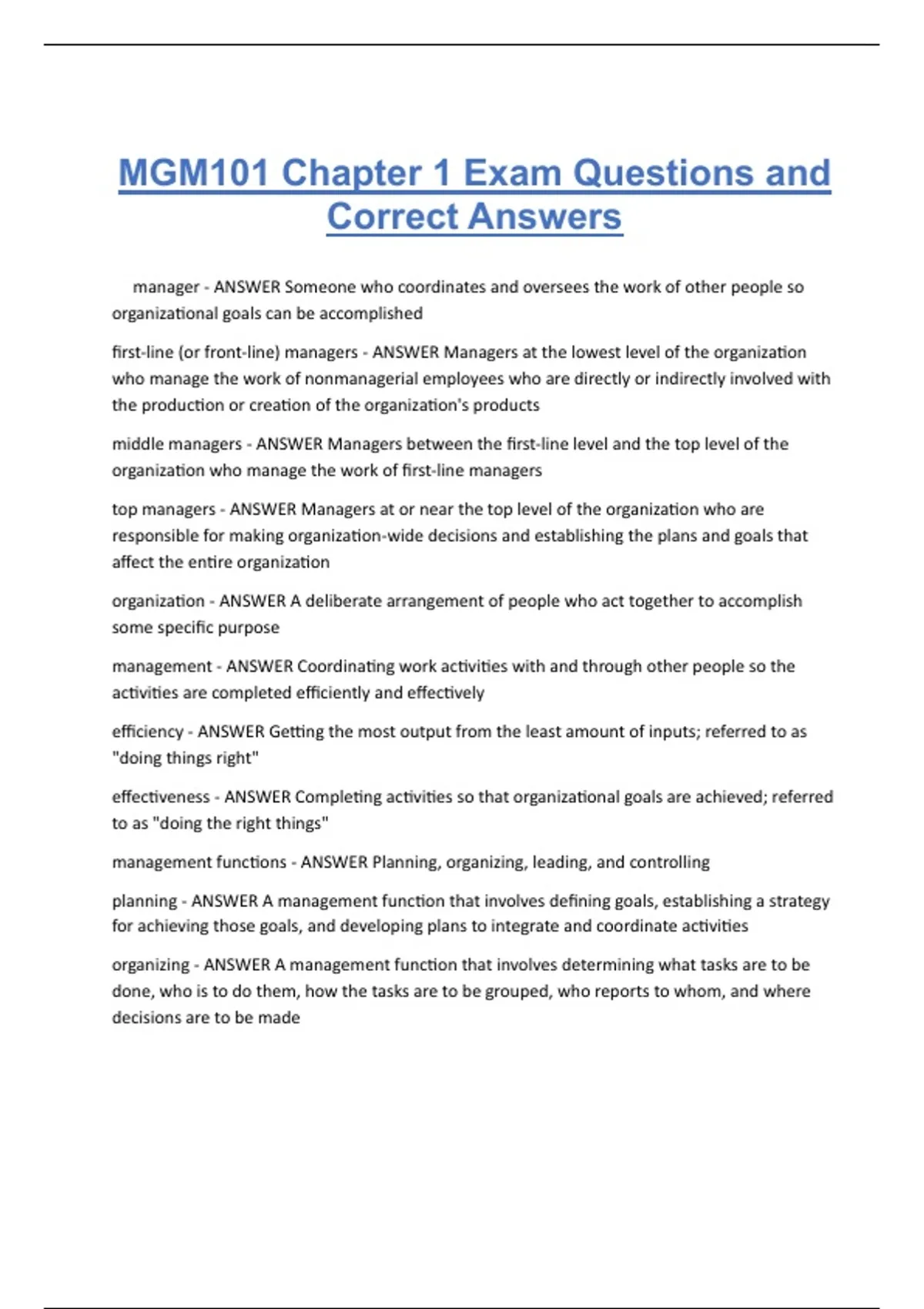 MGM101 Chapter 1 Exam Questions and