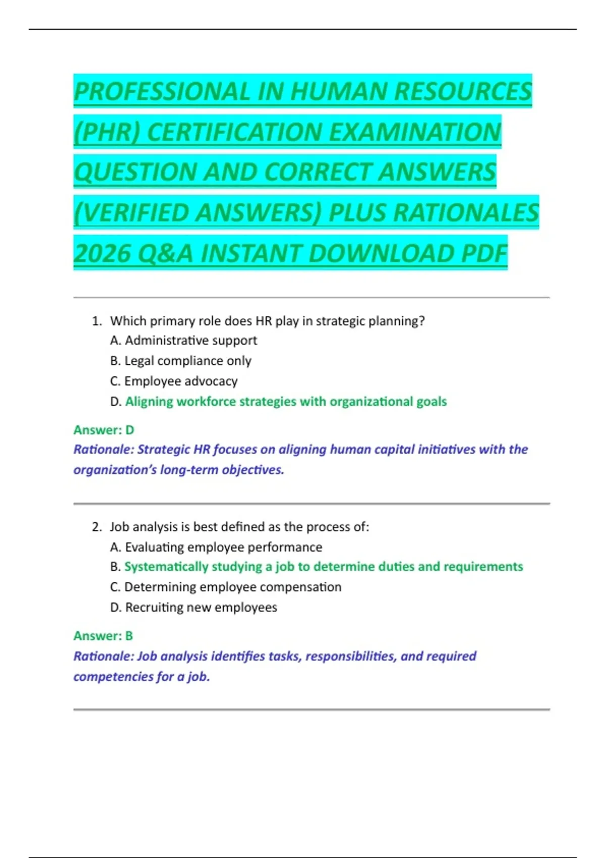 PROFESSIONAL IN HUMAN RESOURCES (PHR) CERTIFICATION EXAMINATION QUESTION AND CORRECT ANSWERS (VERIFIED ANSWERS) PLUS RATIONALES 2026 Q&A INSTANT DOWNLOAD PDF