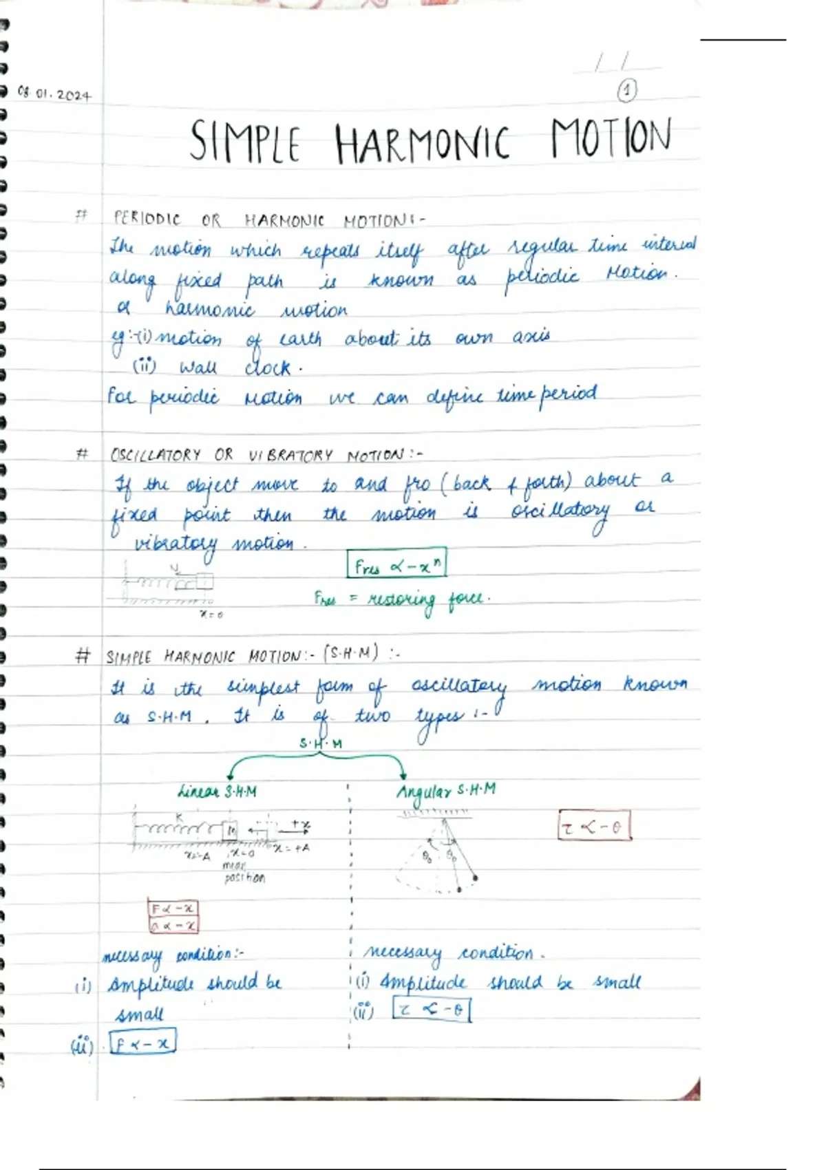 Simple Harmonic Motion (SHM) | Class 11 Physics Complete Chapter Notes with Theory, Formulae, Derivations, Diagrams and Numericals