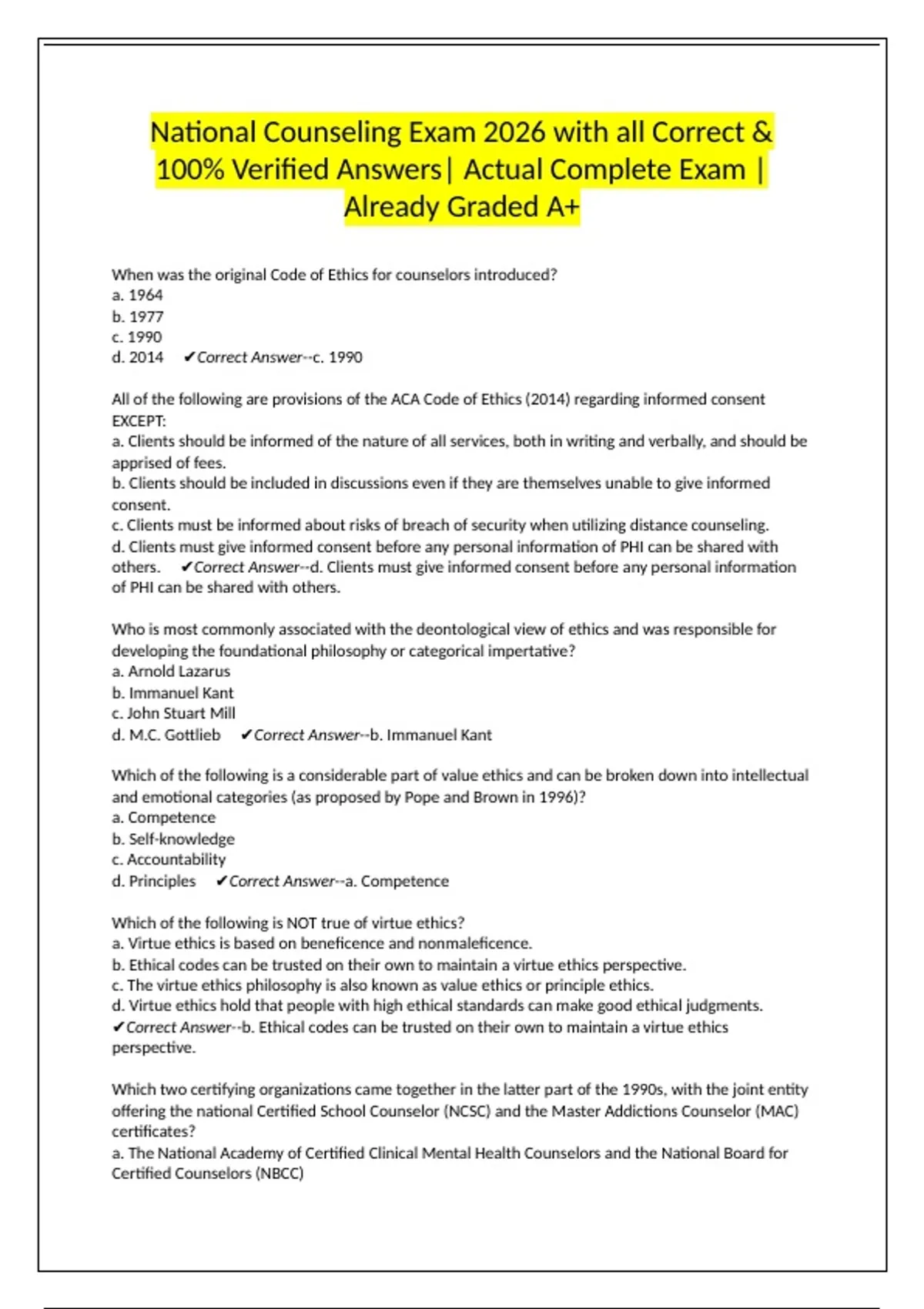 of Certified Clinical Mental Health Counselors ✔Correct Answer--a. The National Academy of