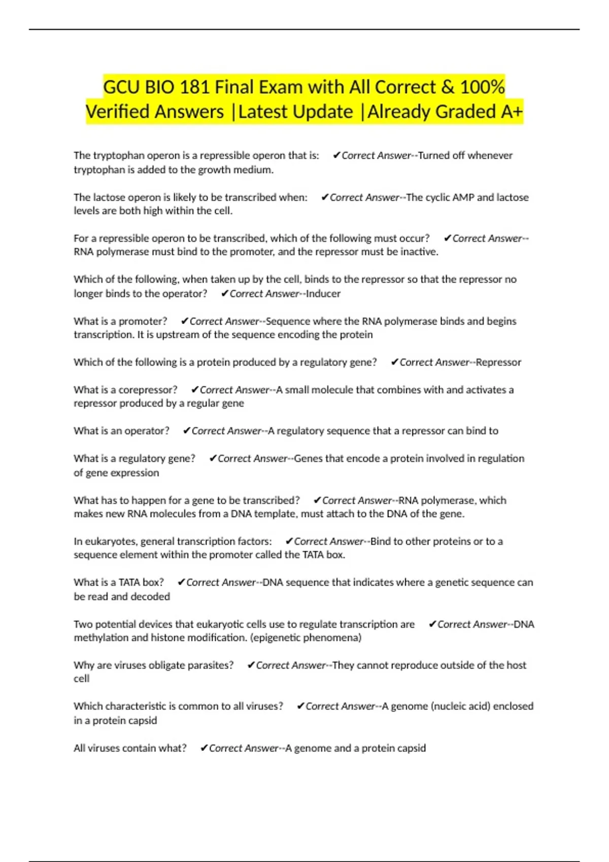 GCU BIO 181 Final Exam with All Correct & 100% Verified Answers |Latest Update |Already Graded A+