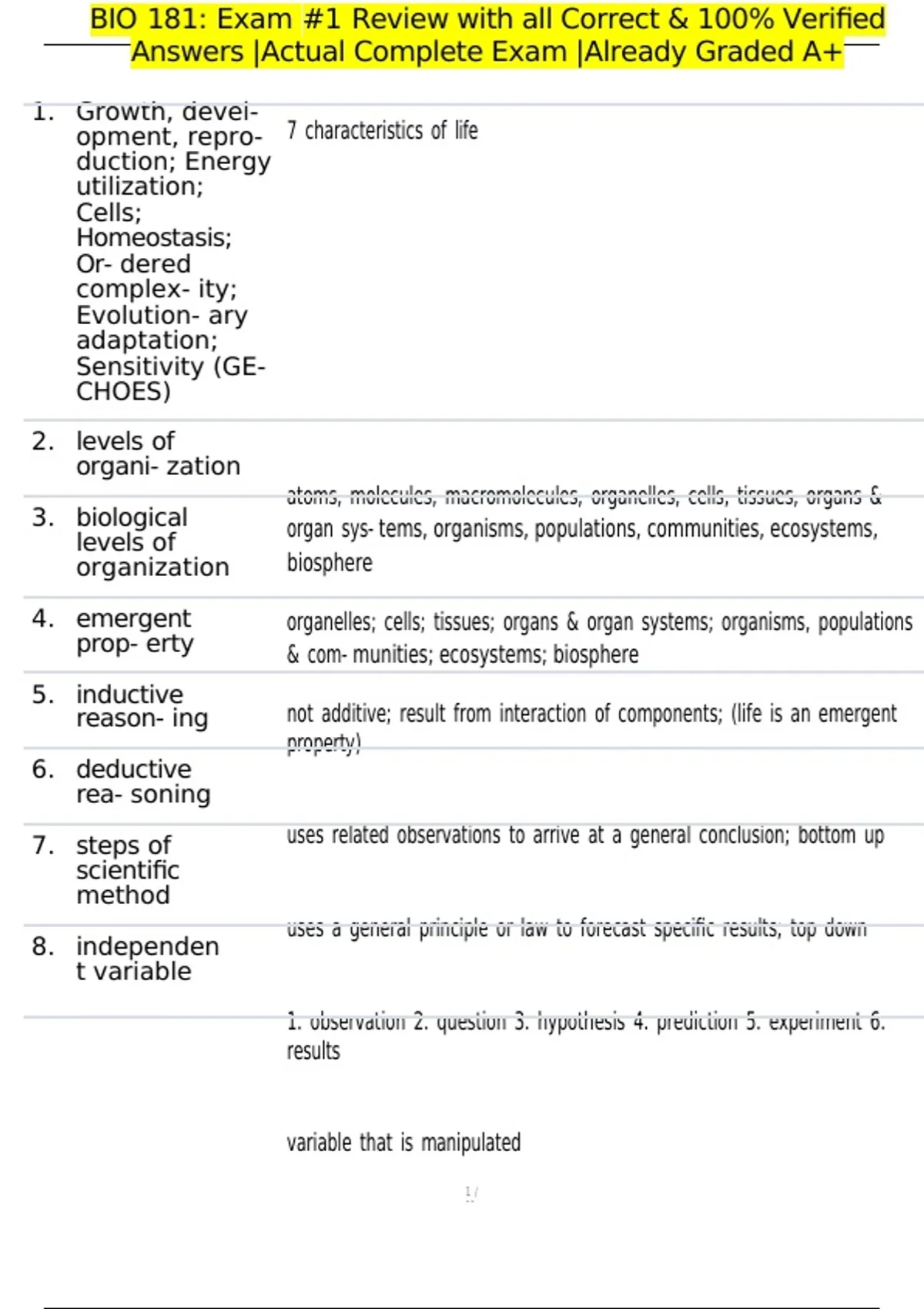 BIO 181: Exam #1 Review with all Correct & 100% Verified