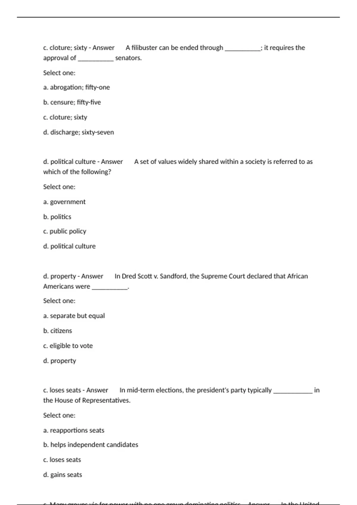 d. political culture - Answer A set of values widely shared within a society is referred to as