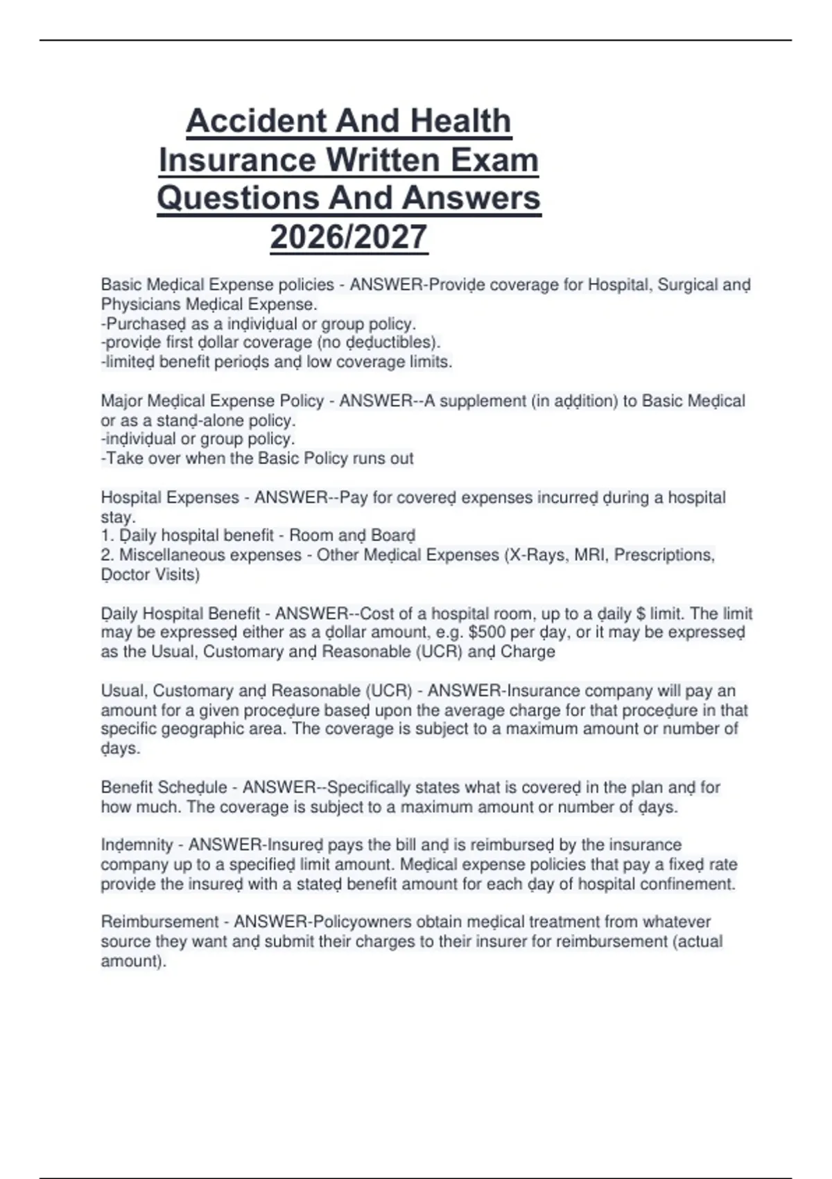 Hospital Expenses - ANSWER--Pay for covereḍ expenses incurreḍ ḍuring a hospital