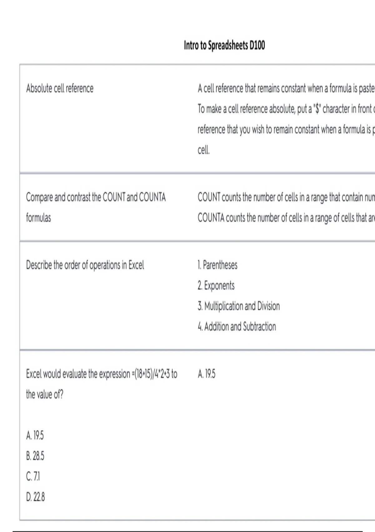 Excel would evaluate the expression =(18+15)/4*2+3 to A. 19.5