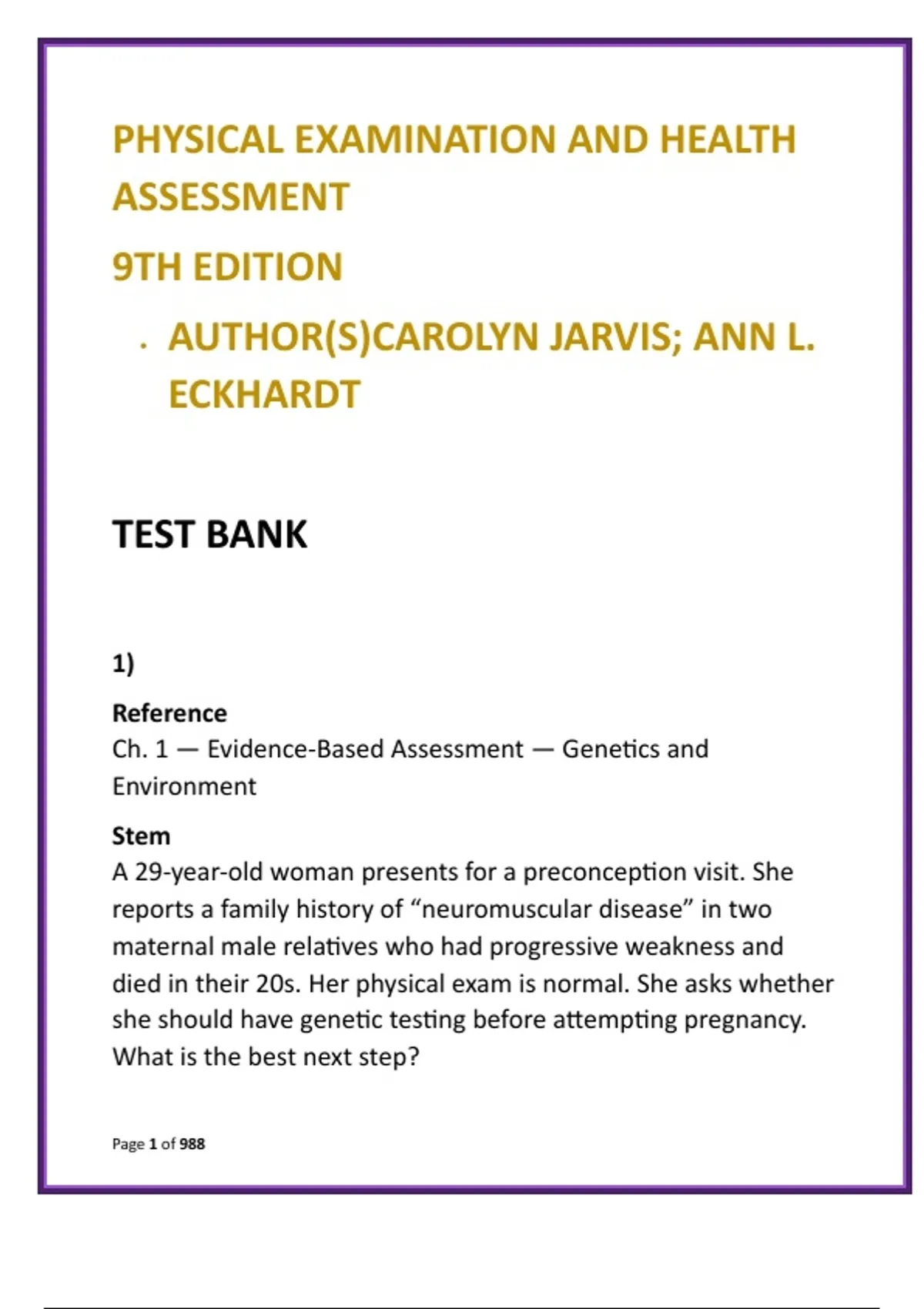 Comprehensive Health Assessment Test Bank | Jarvis & Eckhardt 9e | Physical Exam MCQs Achieve mastery in physical examination and clinical assessment with this comprehensive Physical Examination and Health Assessment Test Bank (9th Edition) by Carolyn Jarvis and Ann L. Eckhardt—the gold standard in health assessment education. Designed to mirror real-world nursing practice and exam expectations, this digital resource delivers full textbook coverage with 20 NCLEX-style multiple-choice questions per chapter, complete with evidence-based rationales. This test bank strengthens clinical judgment through scenario-driven questions spanning comprehensive health history, head-to-toe physical examination, system-based assessment, normal vs. abnormal findings, cultural considerations, patient safety, documentation, and prioritization. Each item reinforces accurate data collection, interpretation, and decision-making—critical for OSCEs, skills labs, and NCLEX readiness. Why this test bank works: it saves study time, targets high-yield assessment concepts, and aligns learning with how clinicians actually examine patients. Students build confidence recognizing deviations from normal, documenting findings correctly, and applying clinical reasoning under exam conditions. Ideal for: Undergraduate nursing students (BSN, ADN), Health Assessment courses, Physical Examination & Clinical Skills labs, NCLEX-RN preparation, early APRN foundations, OSCEs, and competency validation. Features: Full-chapter coverage of Jarvis & Eckhardt, 9th Edition 20 clinically accurate NCLEX-style MCQs per chapter Detailed, evidence-based rationales Head-to-toe and system-focused assessment scenarios Emphasis on documentation, safety, and clinical judgment Digital, searchable, and exam-ready format Keywords: physical assessment test bank Jarvis health assessment MCQs physical examination nursing questions health assessment nursing study guide NCLEX physical assessment questions clinical skills nursing test bank head-to-toe assessment MCQs Jarvis Eckhardt 9th edition test bank Hashtags: #HealthAssessmentNursing #PhysicalExamination #JarvisHealthAssessment #NursingTestBank #ClinicalSkillsNursing #NCLEXPrep #OSCEPreparation #NursingEducation #PhysicalAssessmentMCQs #BSNADNPrep