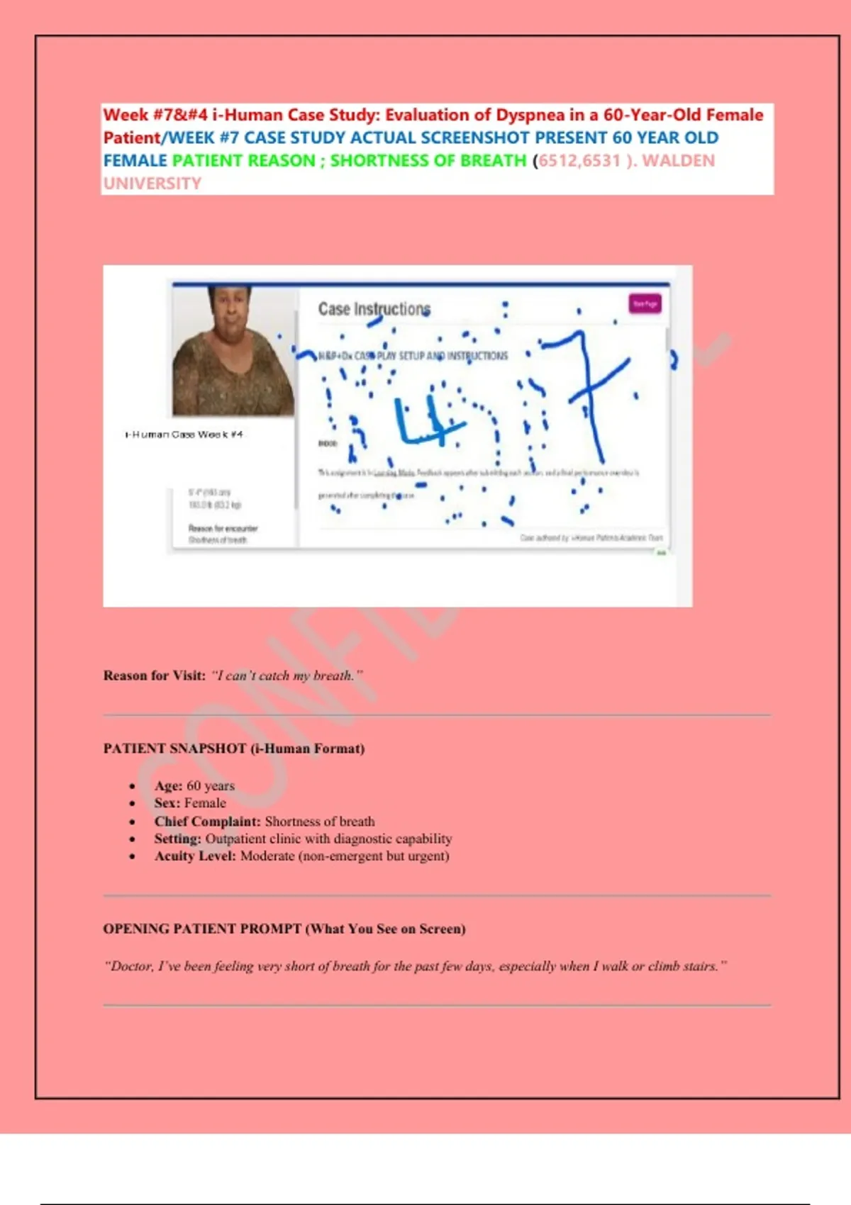Week #7&#4 i-Human Case Study: Evaluation of Dyspnea in a 60-Year-Old Female Patient/WEEK #7 CASE STUDY ACTUAL SCREENSHOT PRESENT 60 YEAR OLD FEMALE PATIENT REASON ; SHORTNESS OF BREATH (6512,6531 ). WALDEN UNIVERSITY