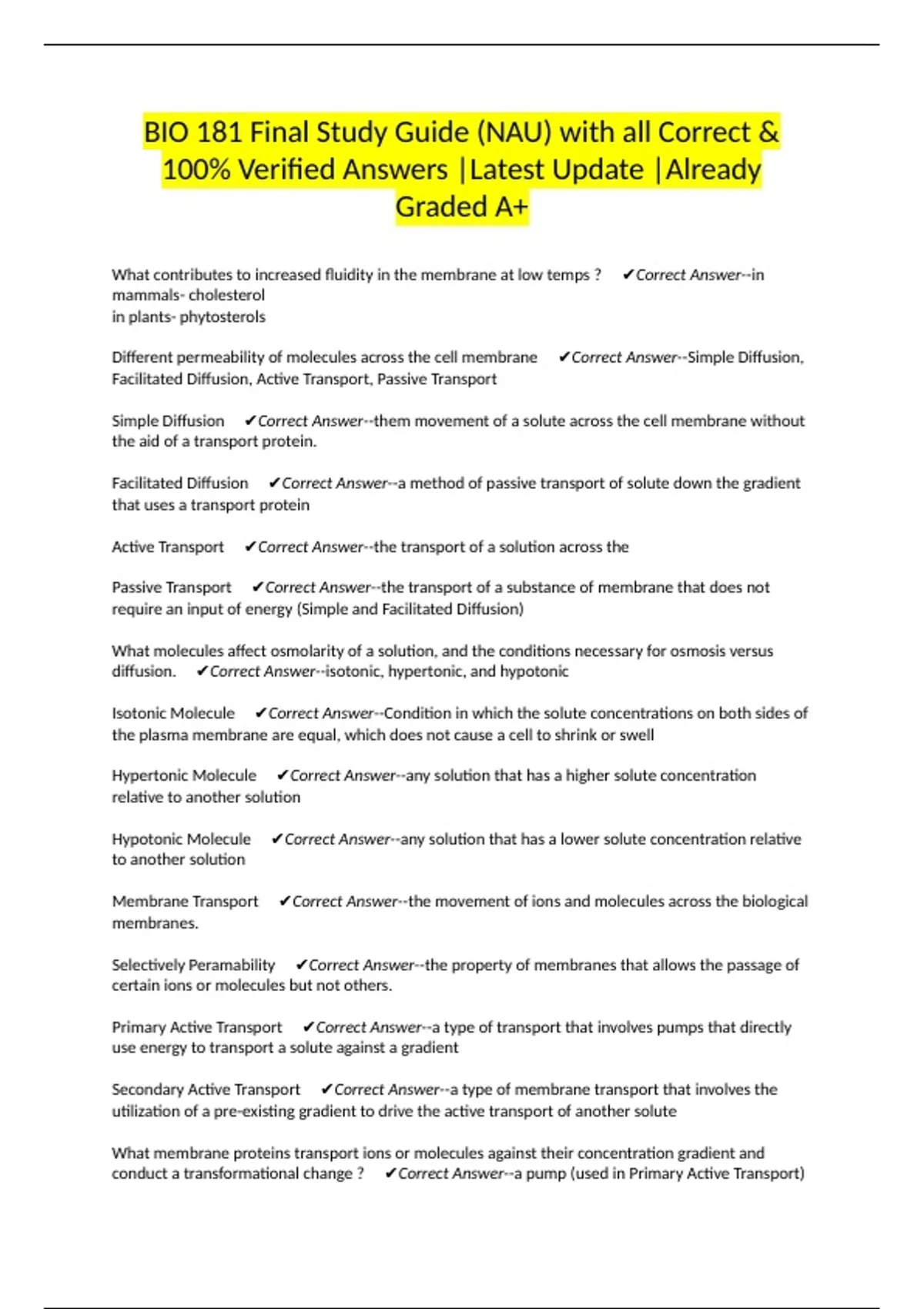 BIO 181 Final Study Guide (NAU) with all Correct & 100% Verified Answers |Latest Update |Already Graded A+