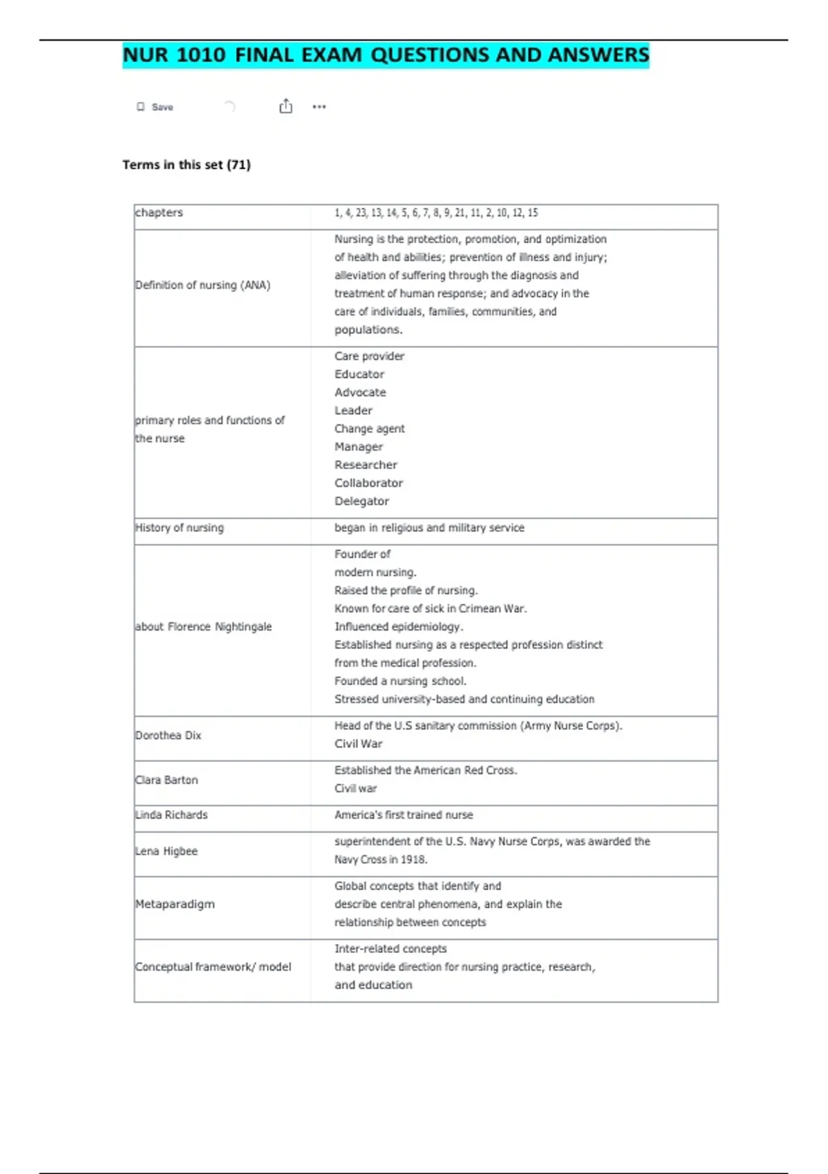 NUR 1010 FINAL EXAM QUESTIONS AND ANSWERS