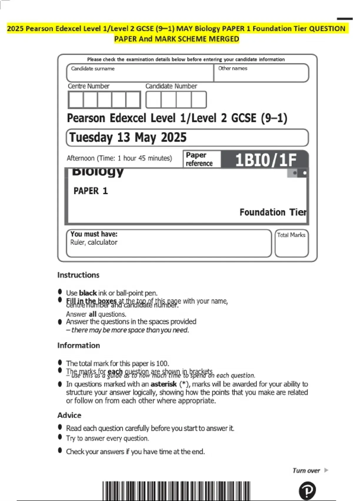 2025 Pearson Edexcel Level 1/Level 2 GCSE (9–1) MAY Biology PAPER 1 Foundation Tier QUESTION PAPER And MARK SCHEME MERGED