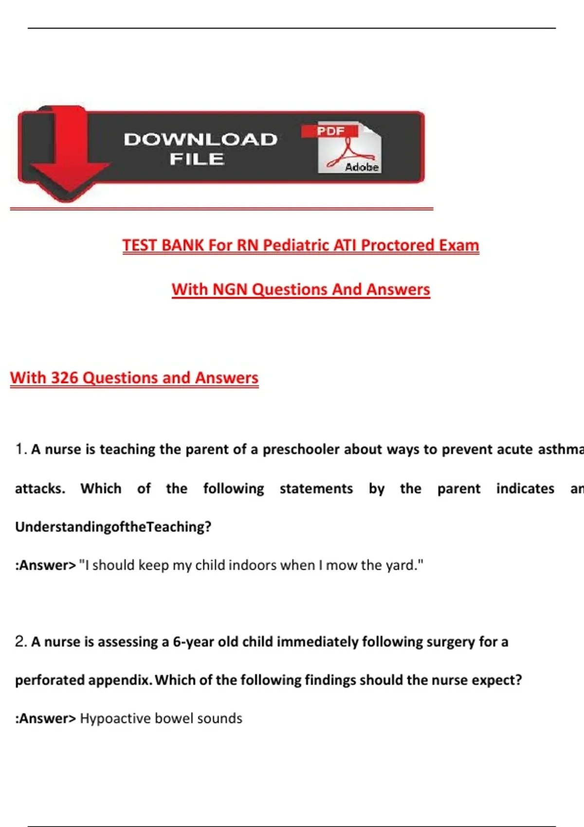 TEST BANK For RN Pediatric ATI Proctored Exam