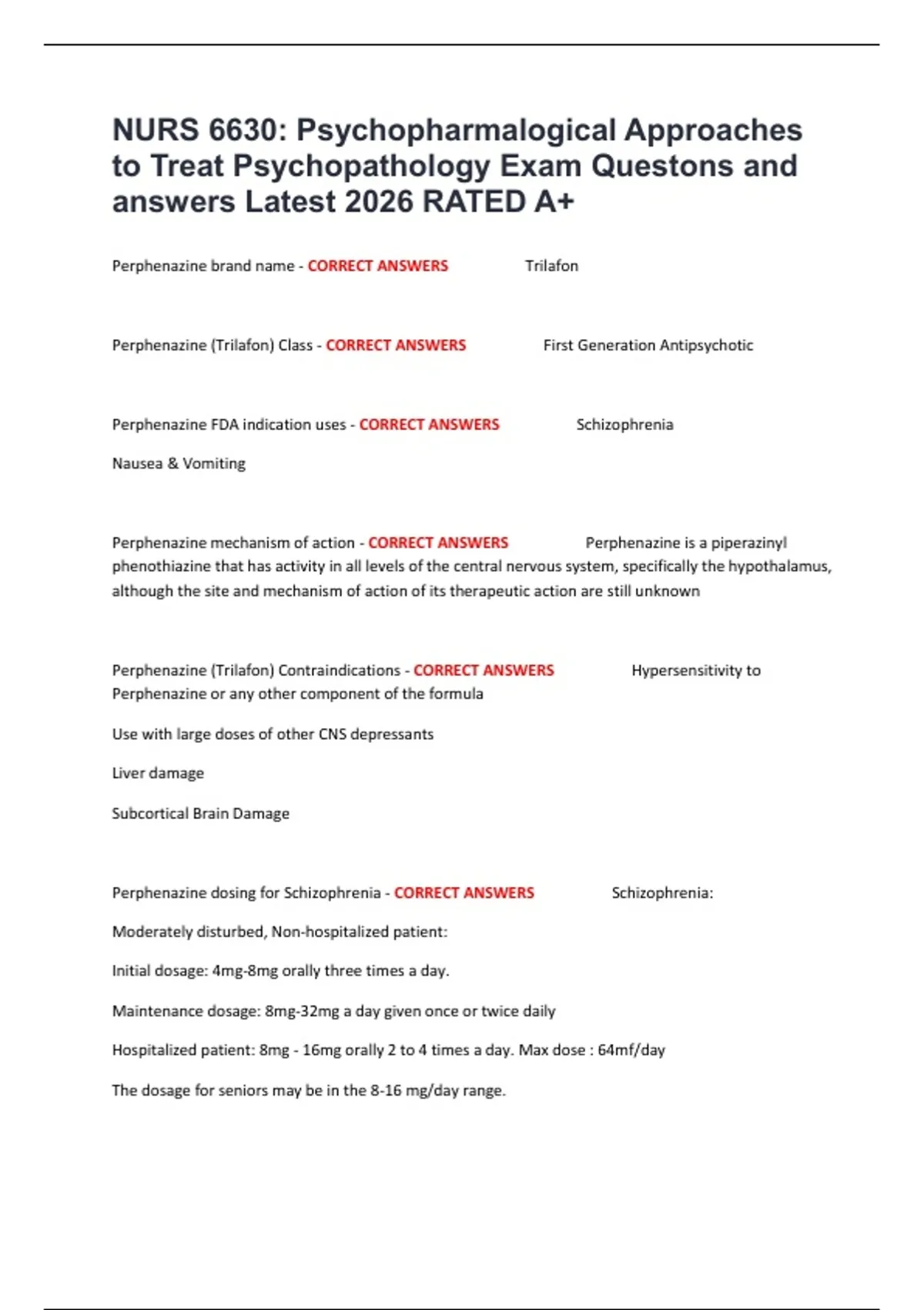 Perphenazine (Trilafon) Class - CORRECT ANSWERS First Generation Antipsychotic