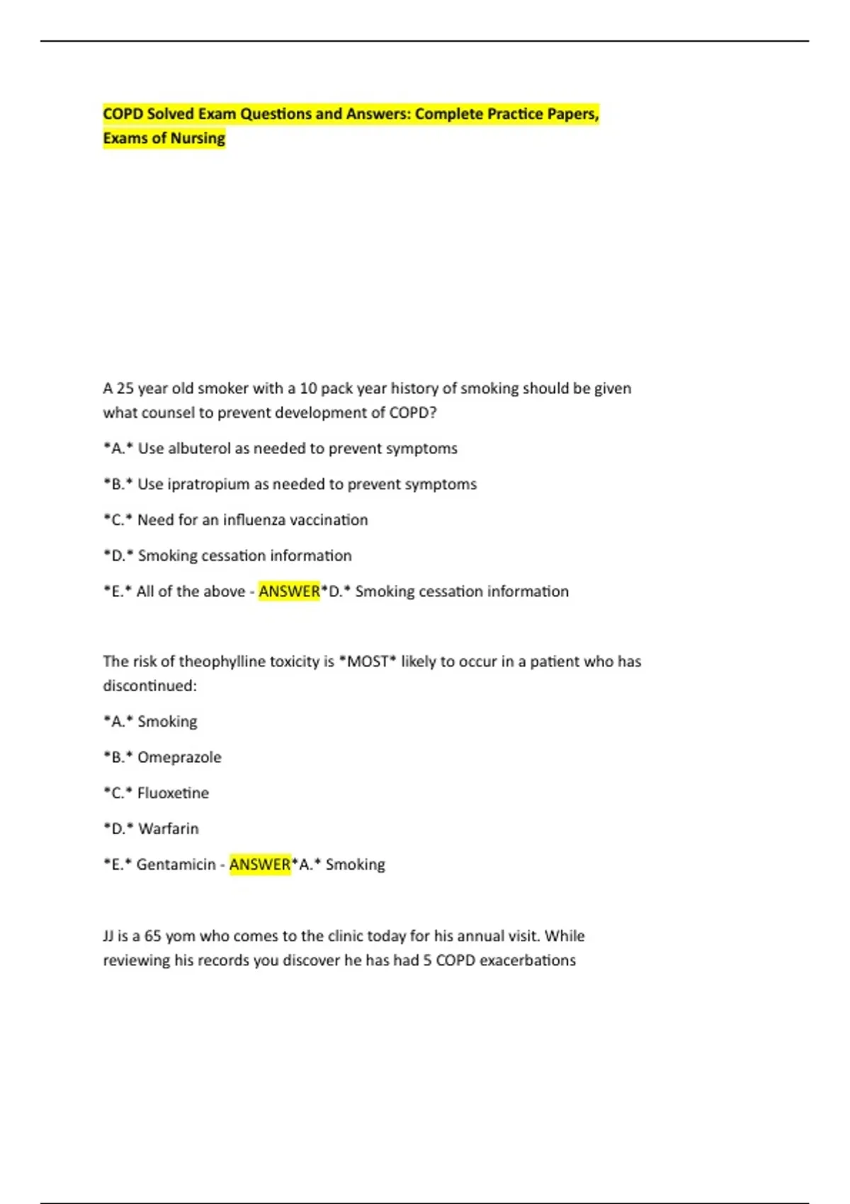 COPD Solved Exam Questions and Answers: Complete Practice Papers, Exams of Nursing