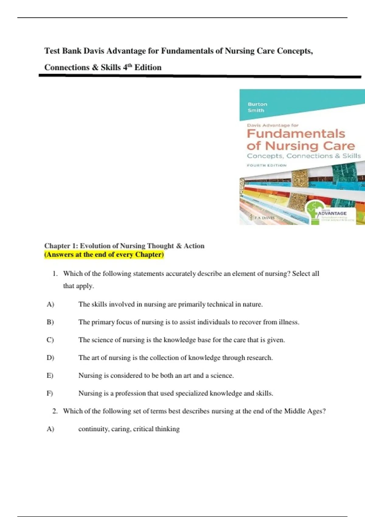 Test Bank Davis Advantage for Fundamentals of Nursing Care Concepts,