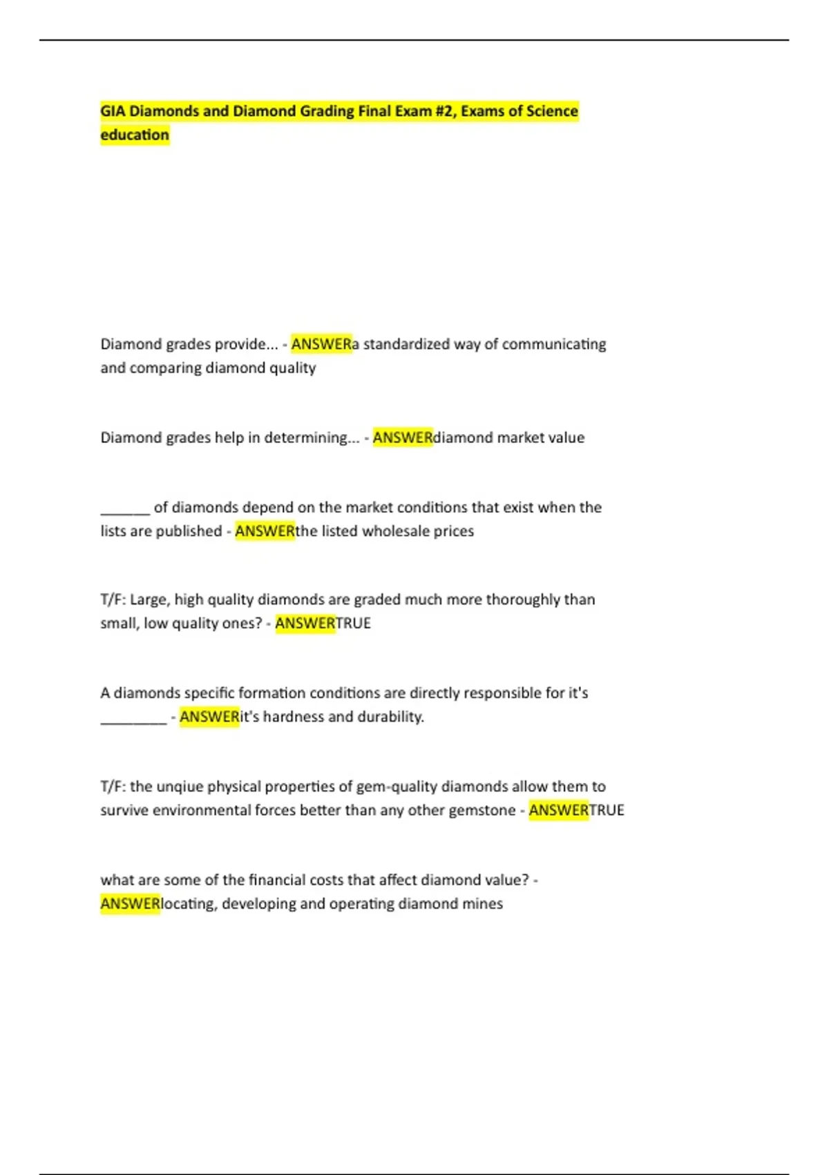 GIA Diamonds and Diamond Grading Final Exam #2, Exams of Science education